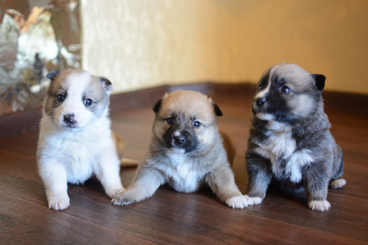 На последнем фото , где они все вместе - белый и самый темный щенок с