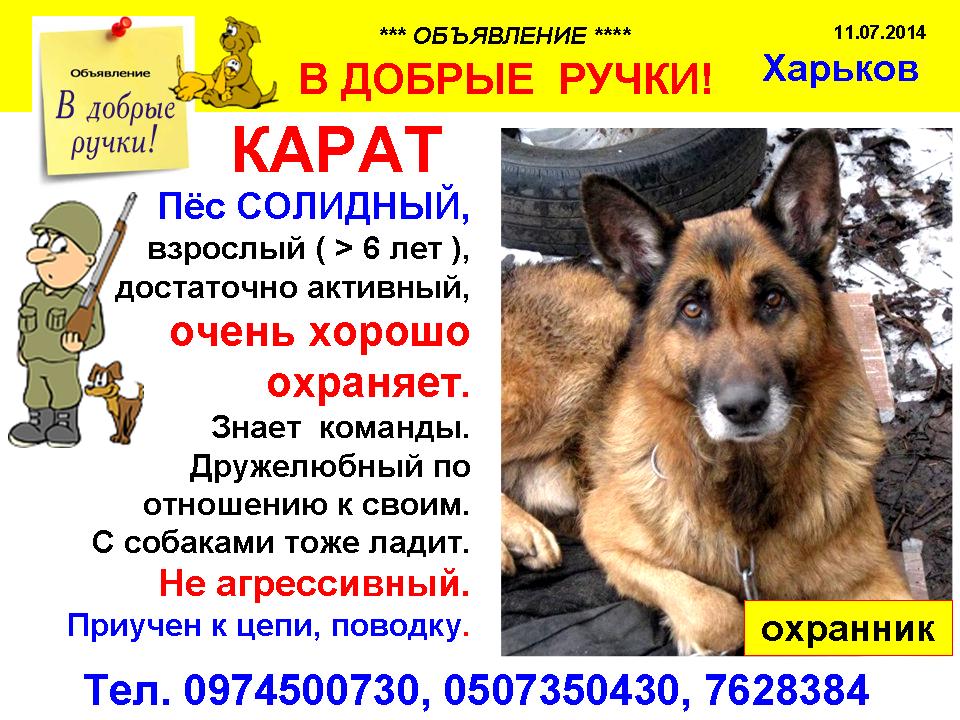 Пес немолодой. Возраст не менее 6 лет, но достаточно активный, очень хорошо охраняет. Выполняет команды. Дружелюбный по отношению к своим. С собаками тоже ладит. Не агрессивный. Приучен к цепи, поводку. Для двора - просто великолепный охранник. Будем рассматривать только серьезные варианты. Хотелось бы отдать его своим, проверенным людям.