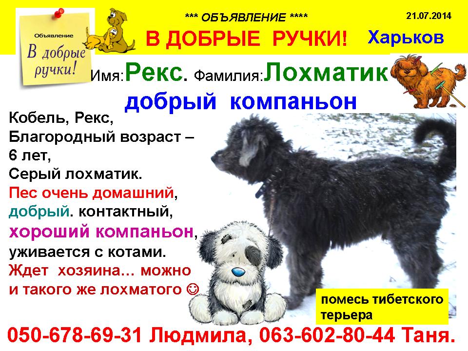 Кобель, Рекс, 6 лет, порода- помесь тибетского терьера, лохматый , серого цвета, шерсть слегка волнистая. Рексу не повезло с хозяином, и он оказался на улице. Его забрала домой добрая женщина, но долго держать не сможет-в одной комнате уже 3 своих собаки и 2 кошки.Пес очень домашний, добрый. контактный, хороший компаньон, уживается с котами. Будет благодарен тому, кто его приютит и подарит свою любовь и заботу.