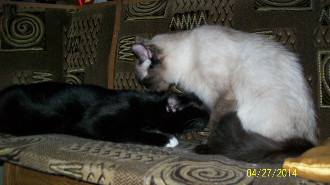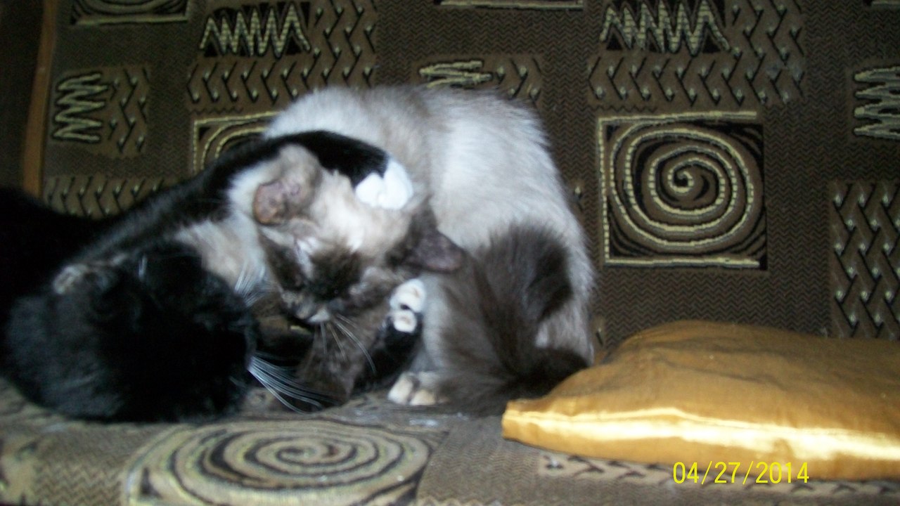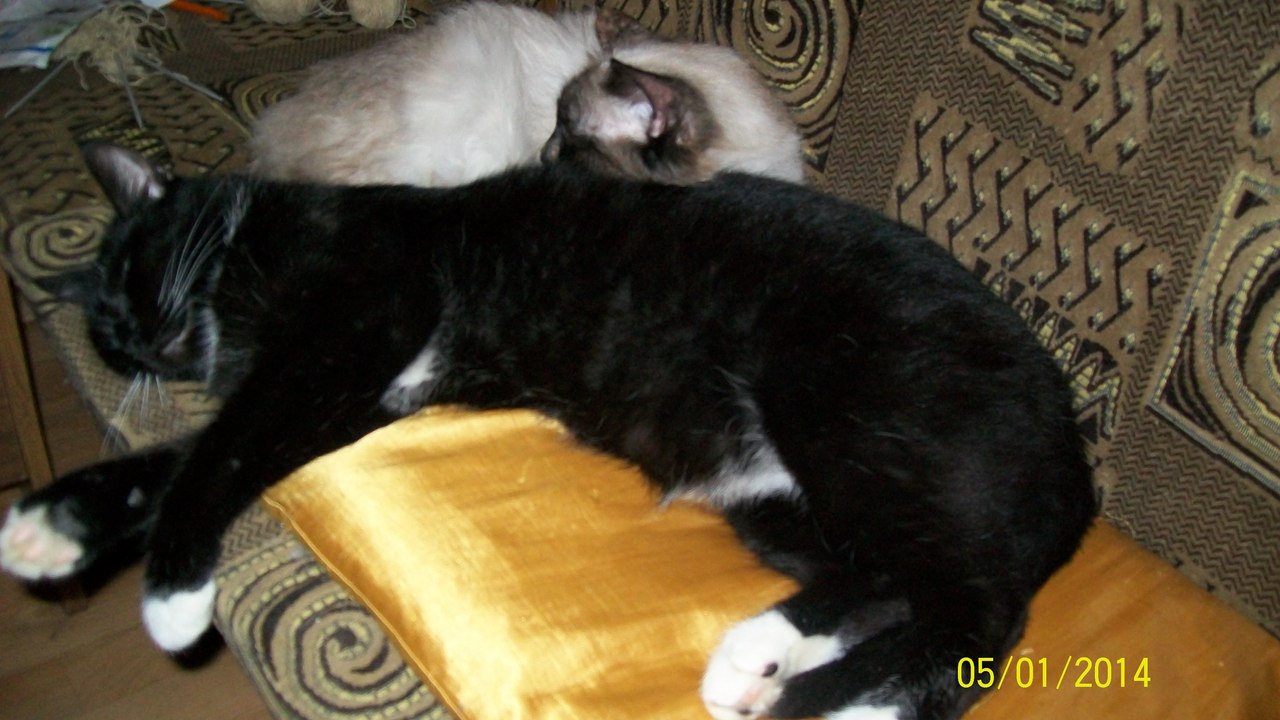 "Здравствуйте, Марина! Дела у нас очень хорошо. Норочка уже совсем освоилась. Поправилась на 200 г. Хорошо кушает и много спит. У нее исчез испуг в глазках и она уже начинает потихоньку играться. С Васькой они то дружат, то дерутся. Хотя, может это у них игра такая. Спят они со мной в постели вдвоем, даже муж уже привык к кошачьему семейству, хотя котов он не сильно любит. А когда приходит сын, то Нора идет к нему, а Вася остается со мной. Единственно, что мне не нравится, это ее шов после операции, она все время его разлизывает и там уплотнение. Как только погода позволит поедем к врачу. А вообще, она девочка очень хорошая, ласковая, очень спокойная как для сиамки."