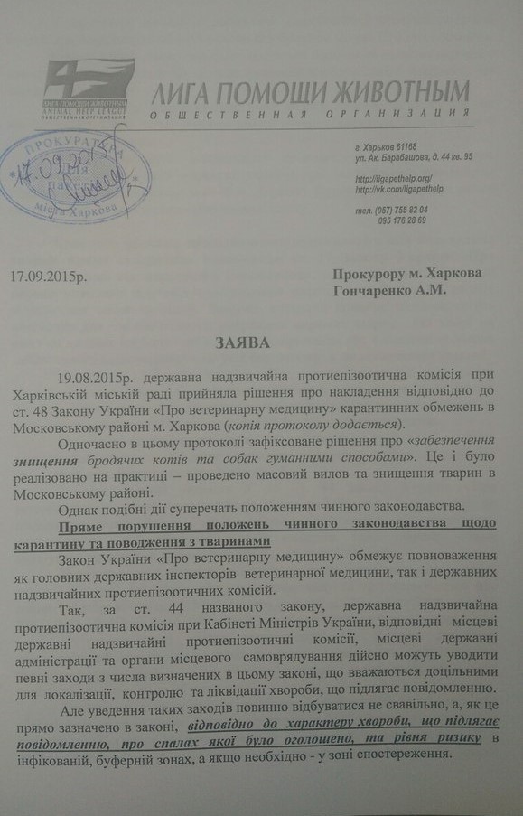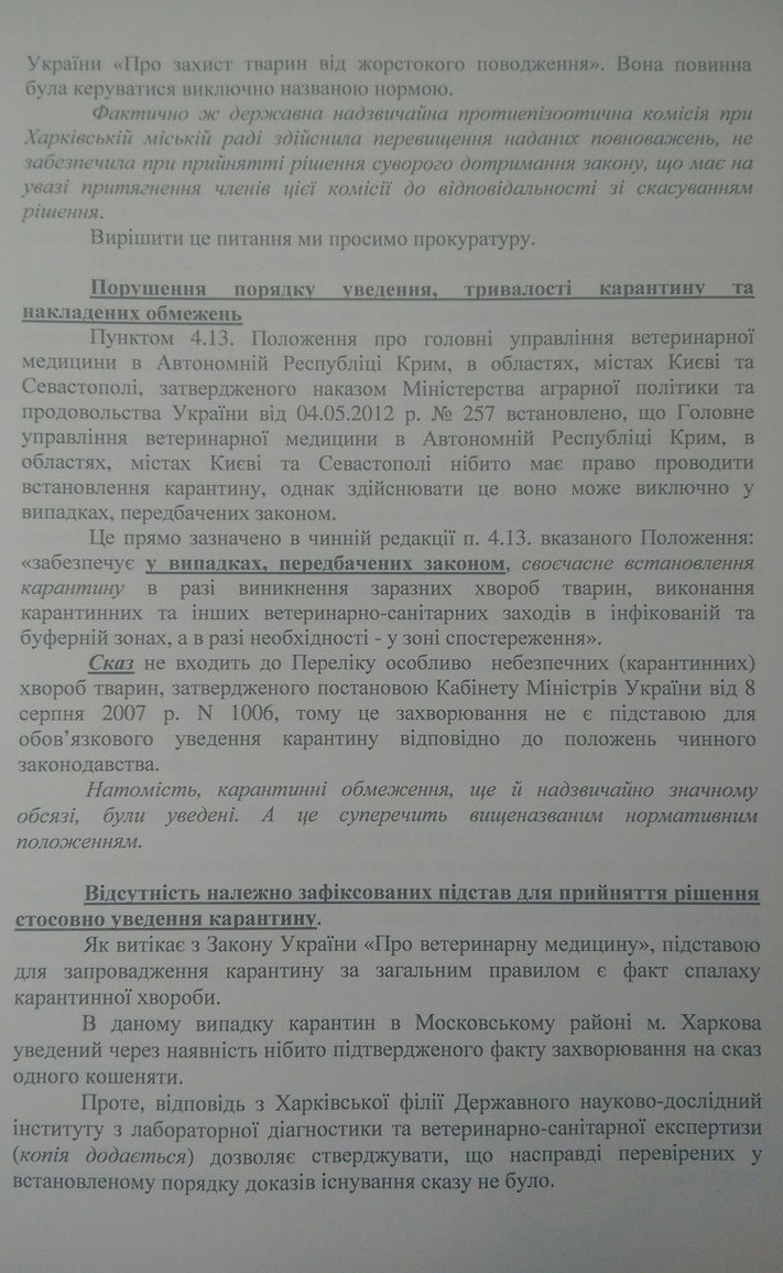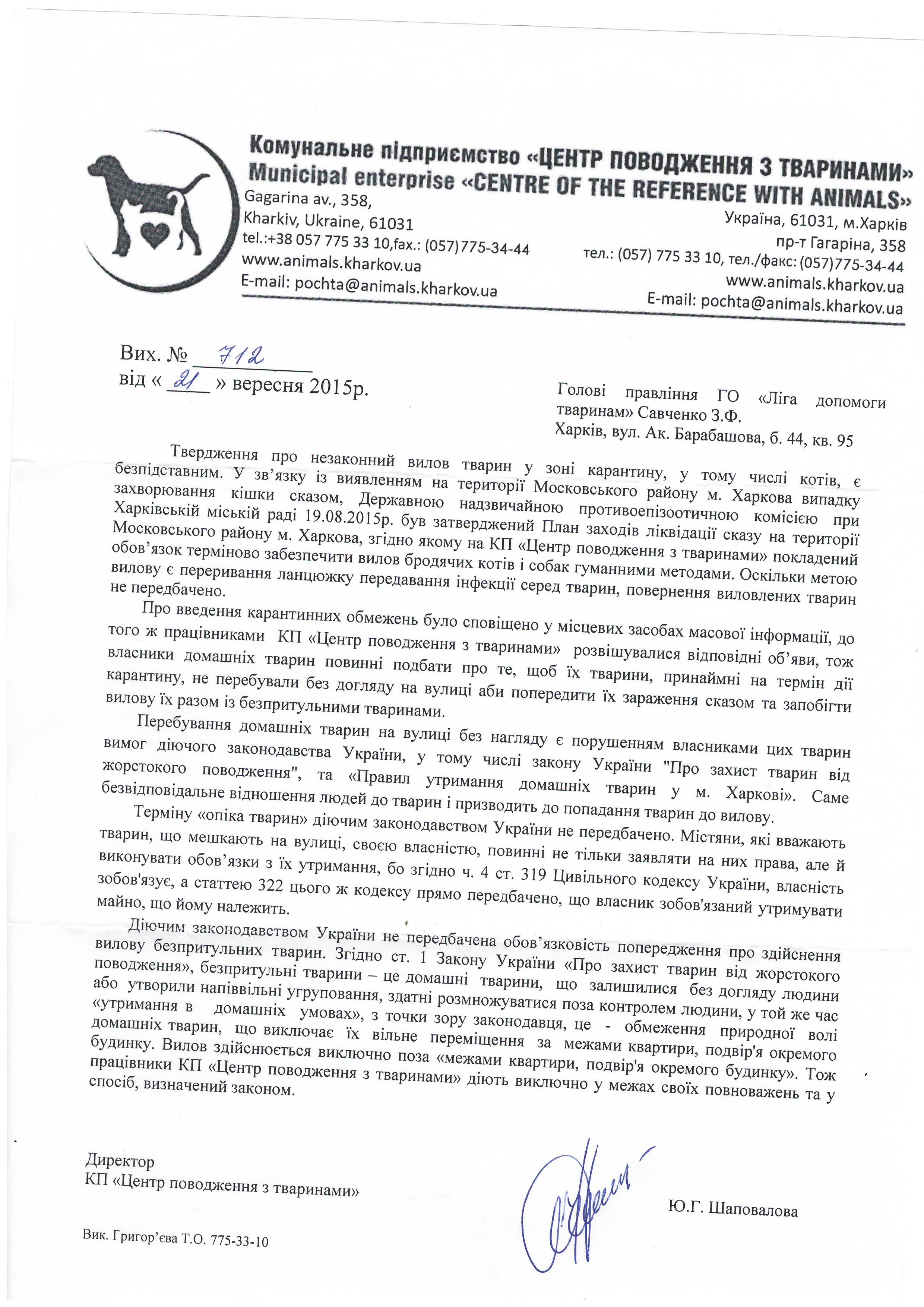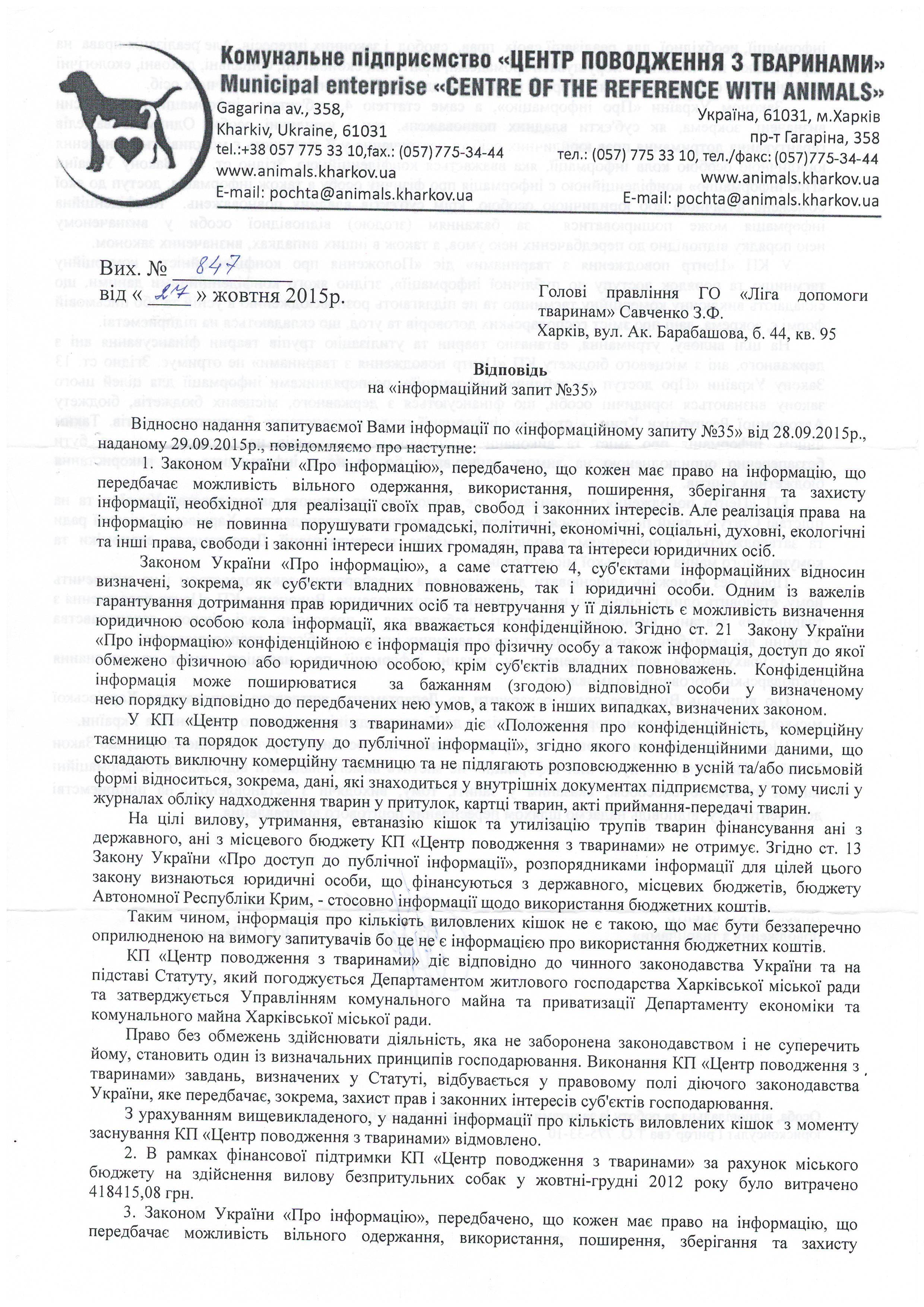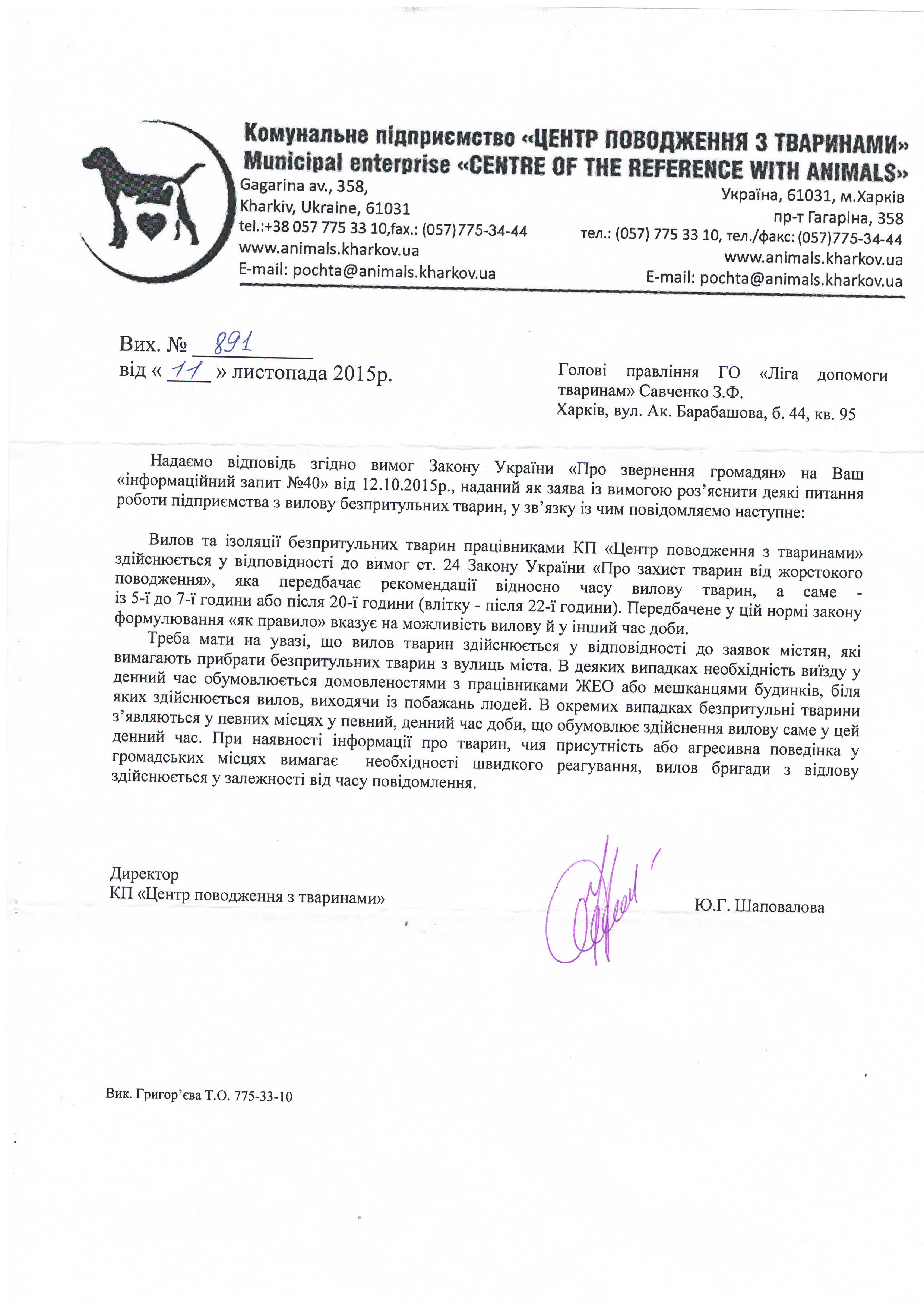1.Чому Ви та працівники КП «ЦПзТ» порушуєте діюче українське законодавство, права та законні інтереси громадян, та не повідомляєте зазначені в ст.340 ЦК України органи про відловлених на вулицях Харкова котів та собак для того, щоб здійснити пошук їх власників?