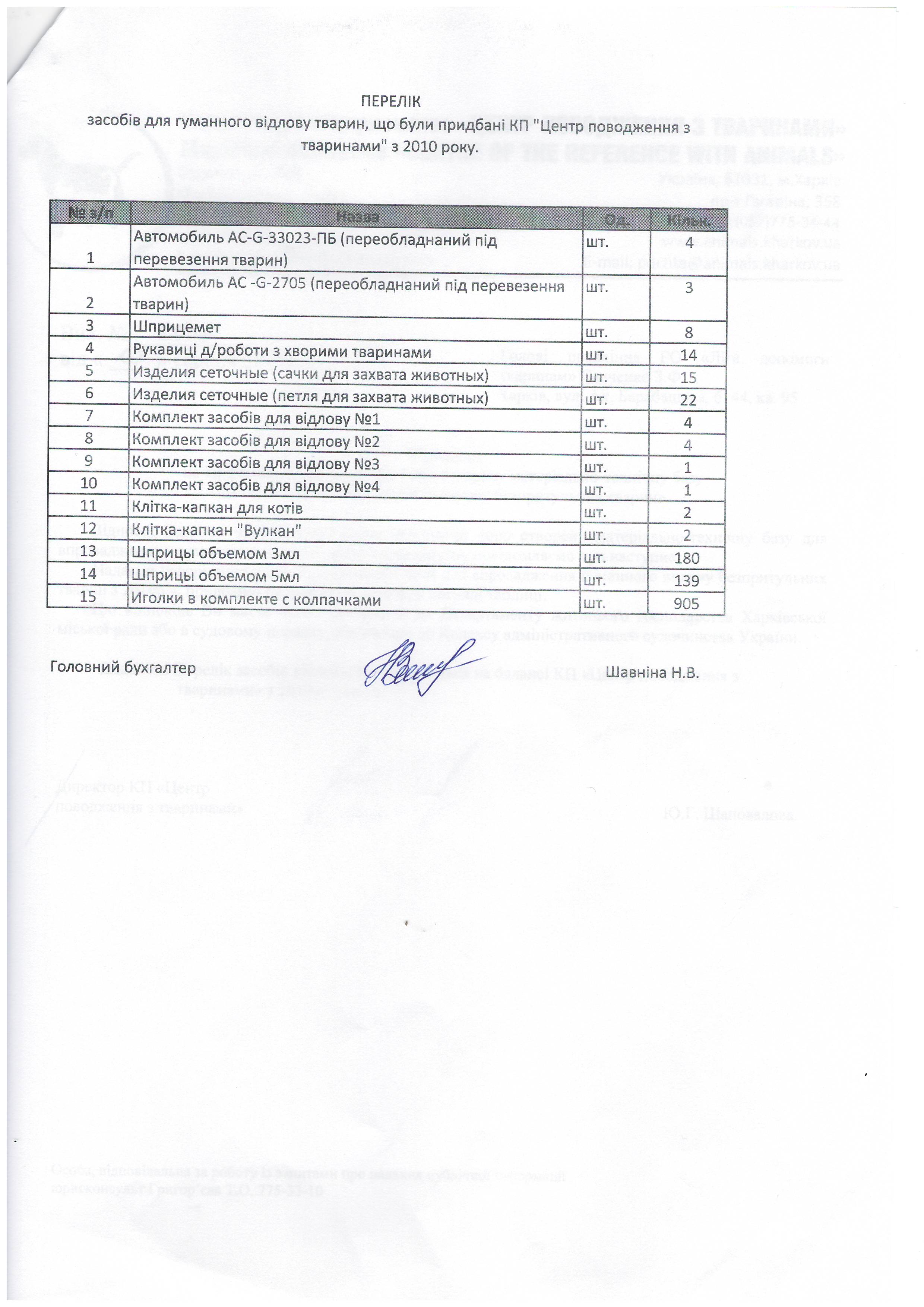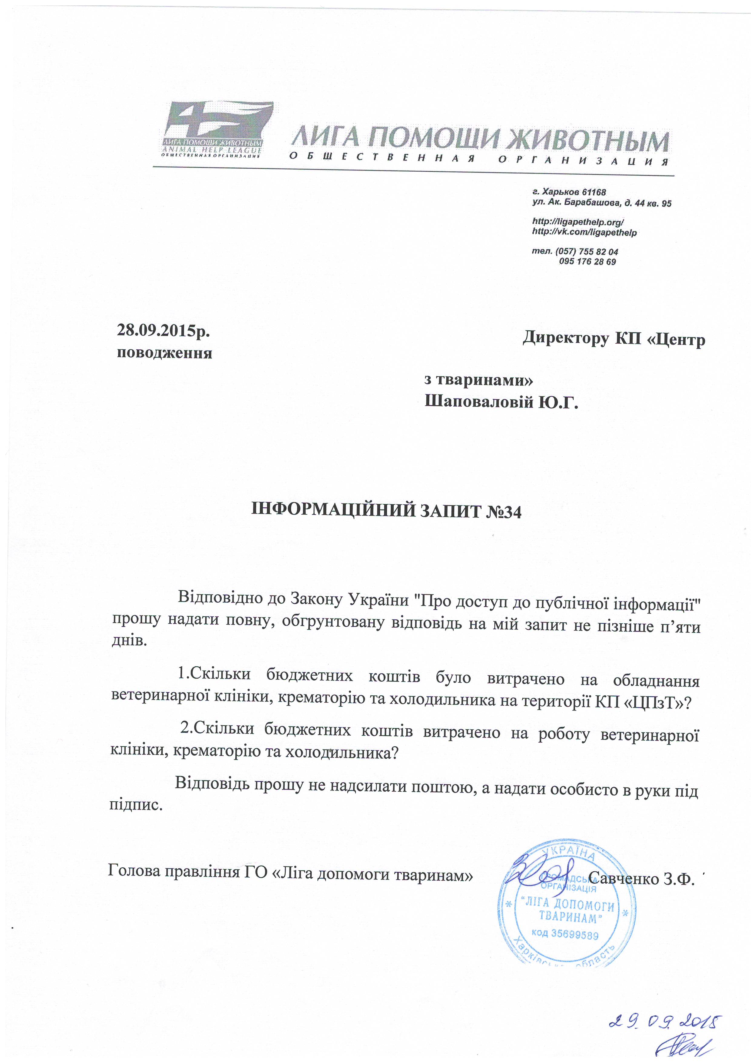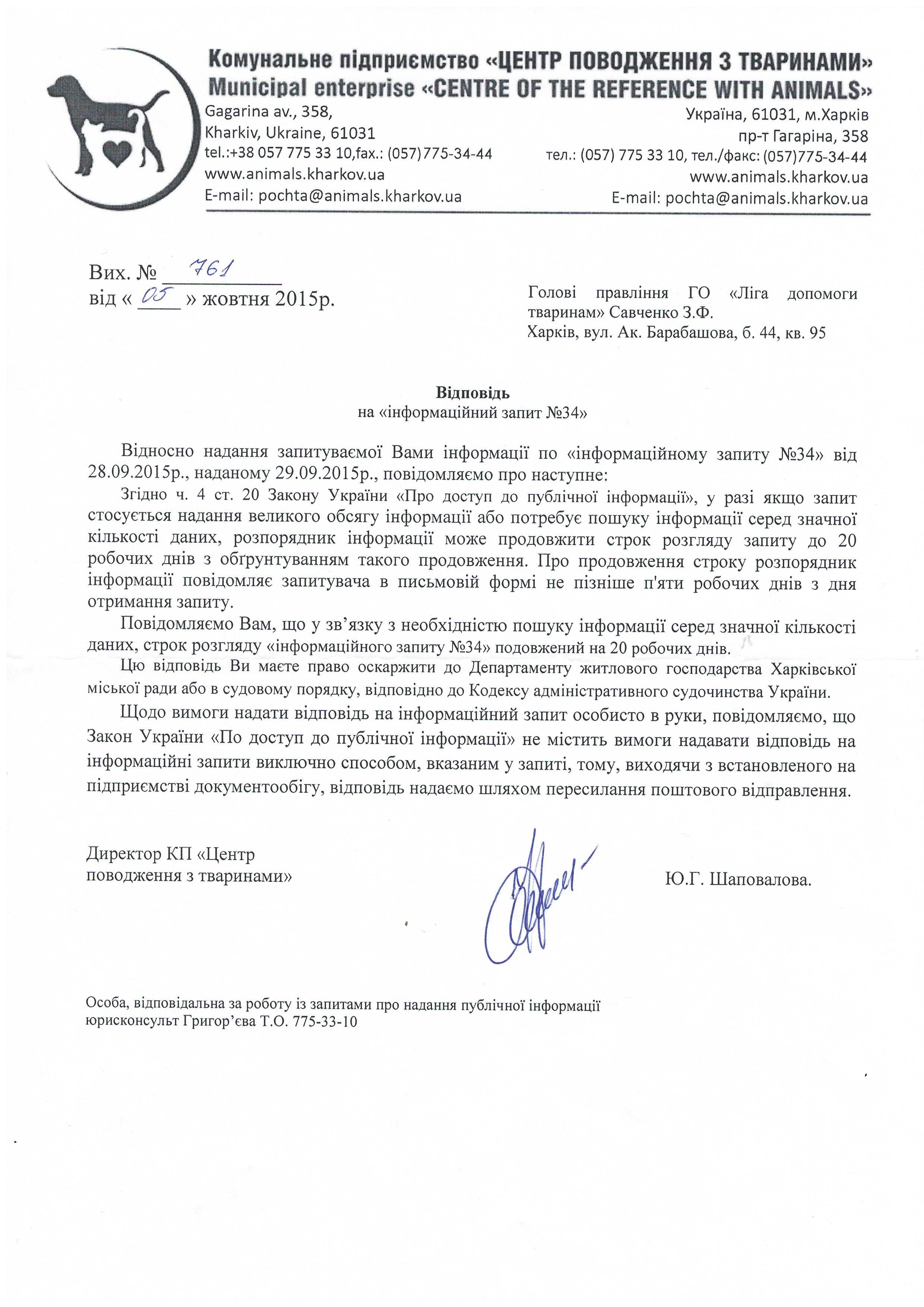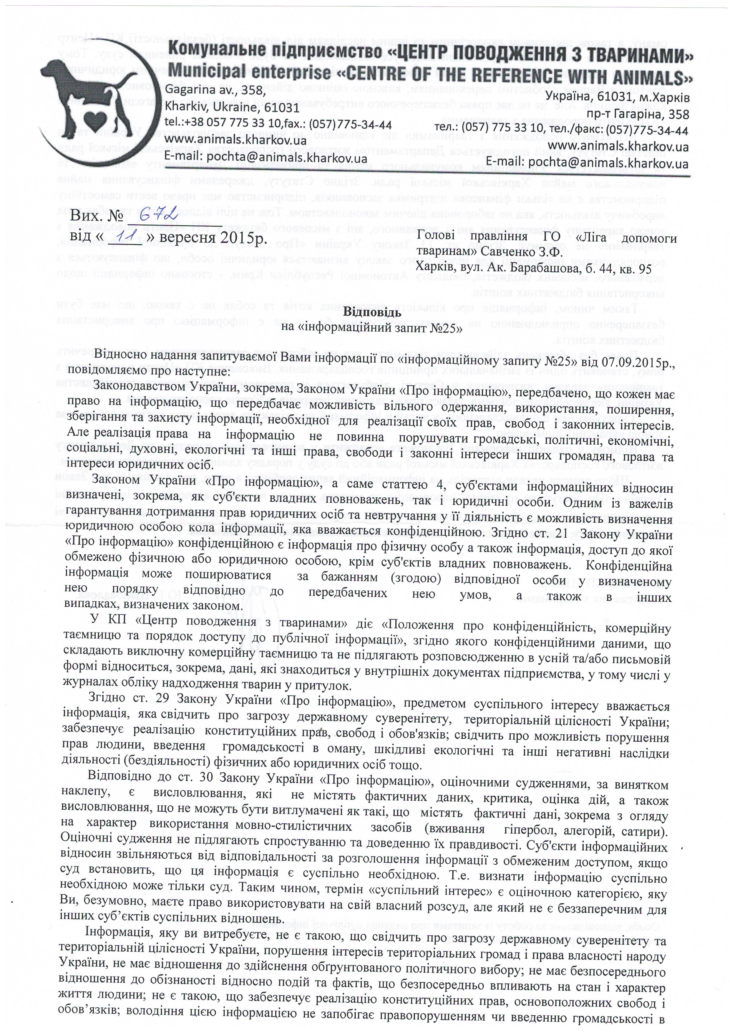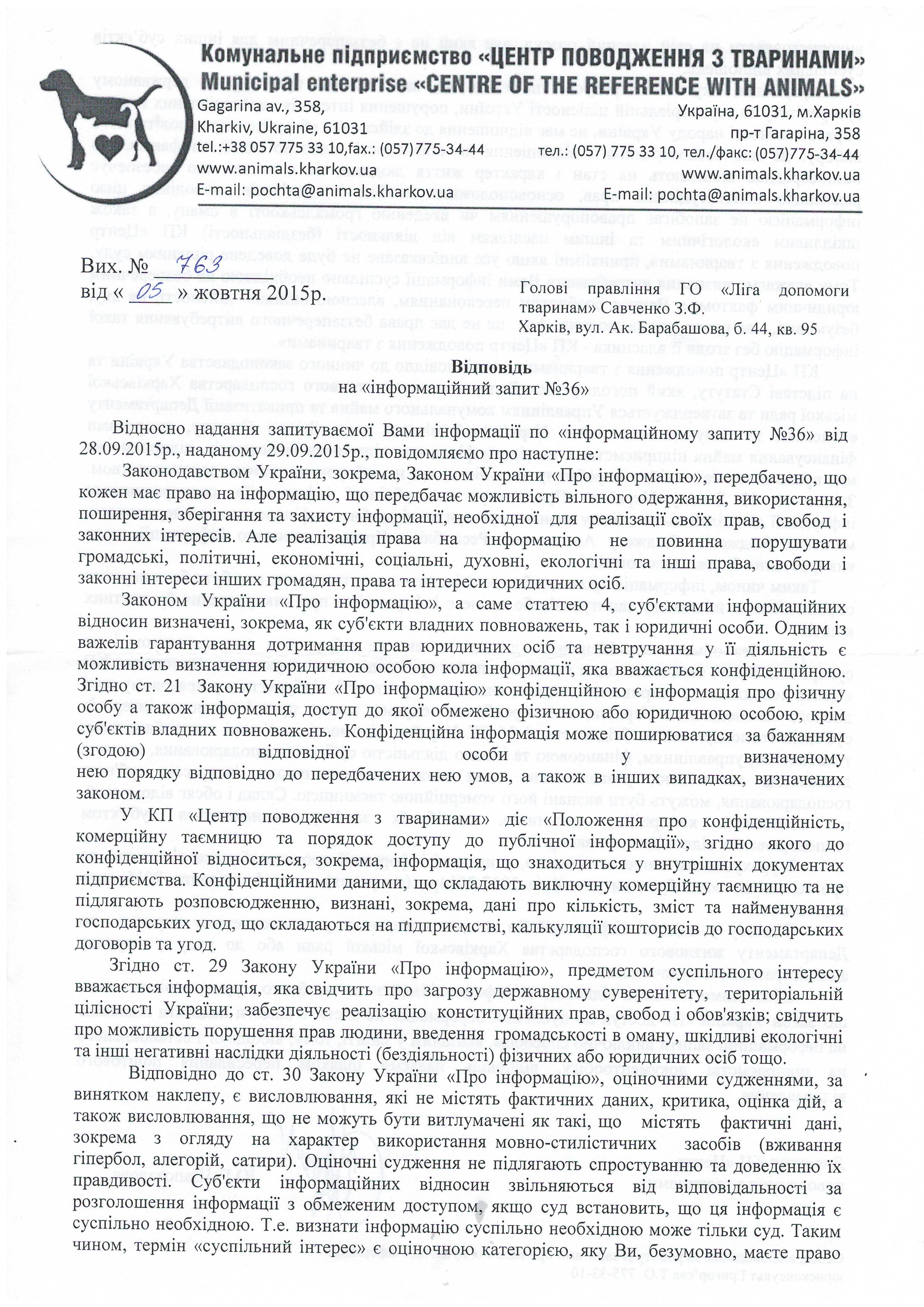 1.Чому Ви та працівники КП «ЦПзТ» порушуєте діюче українське законодавство, права та законні інтереси громадян, та не повідомляєте зазначені в ст.340 ЦК України органи про відловлених на вулицях Харкова котів та собак для того, щоб здійснити пошук їх власників?