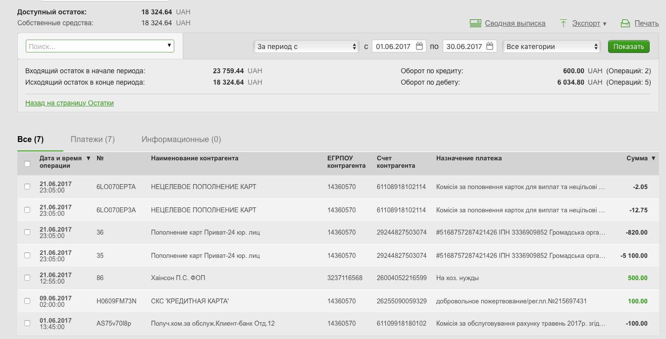 22.11.2017 переказ зі свого карткового рахунку на розраунковий рахунок