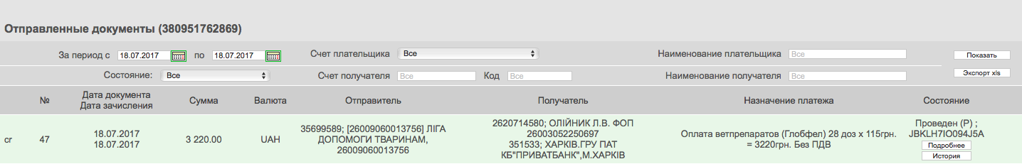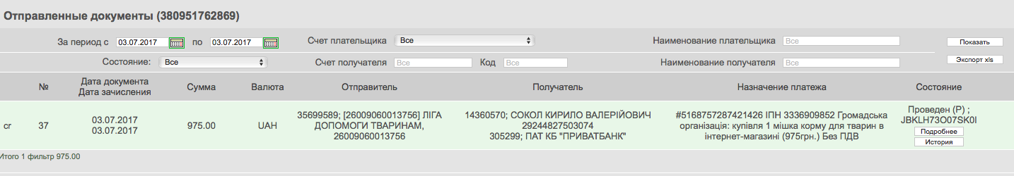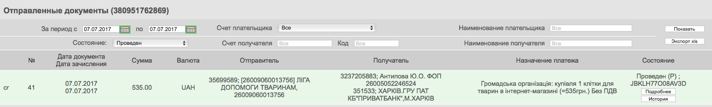 Также Лига закупила 1 клетку "Лори" = 535грн. (07.07.17) и 5 клеток Trixie (78х62х55) скан с банка ниже (08.07.17)