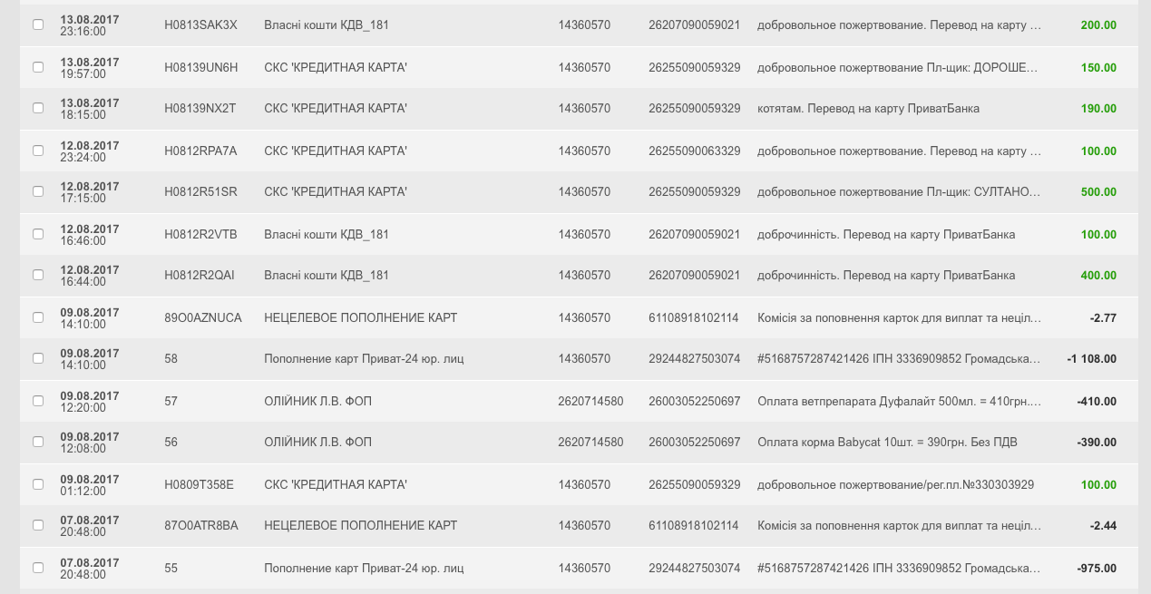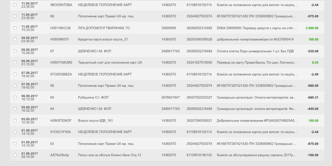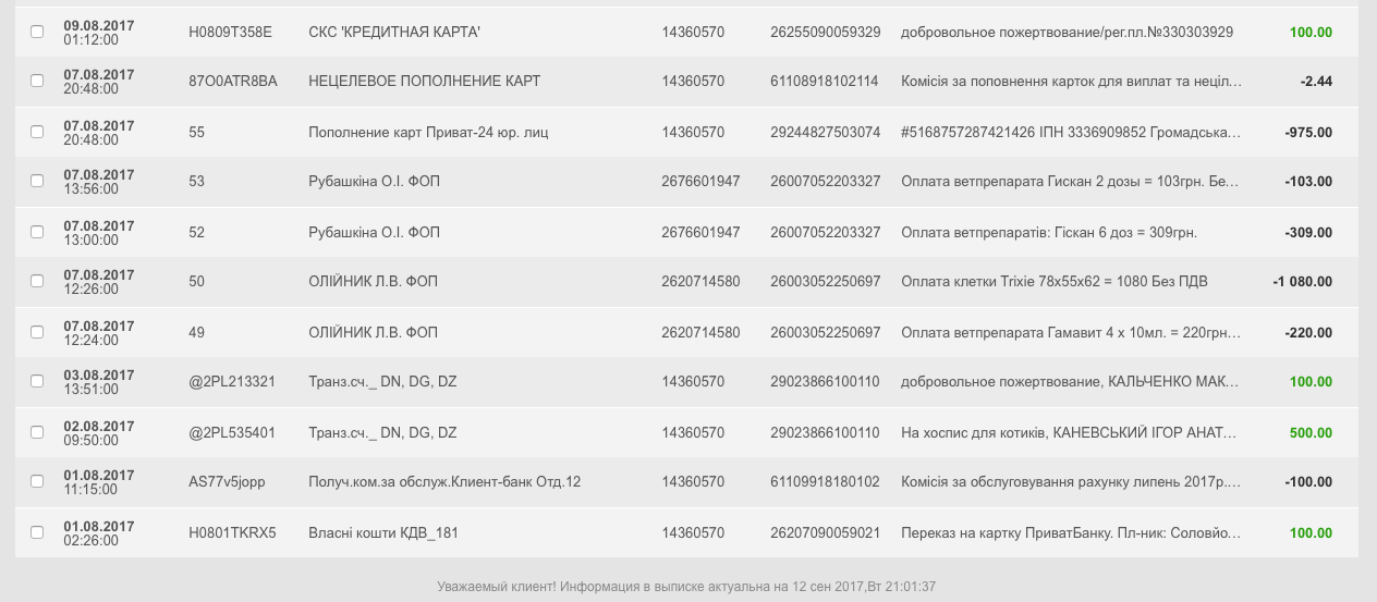 23.10.2017р. +300грн. добровольное пожертвование на корм животным Пл-щик: Михайленко Наталія