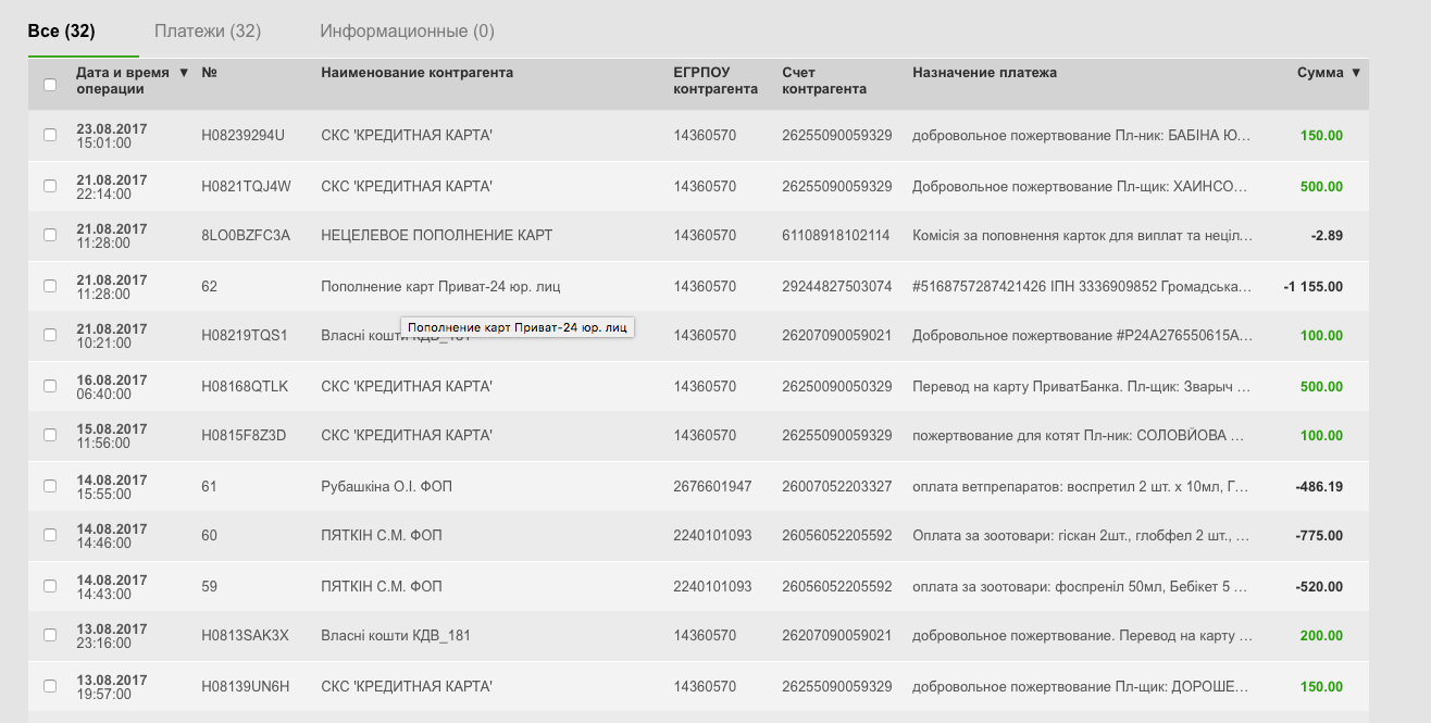 18.10.2017р. +500грн. (добровільна пожертва від ФОП Хаінсон П.С.)