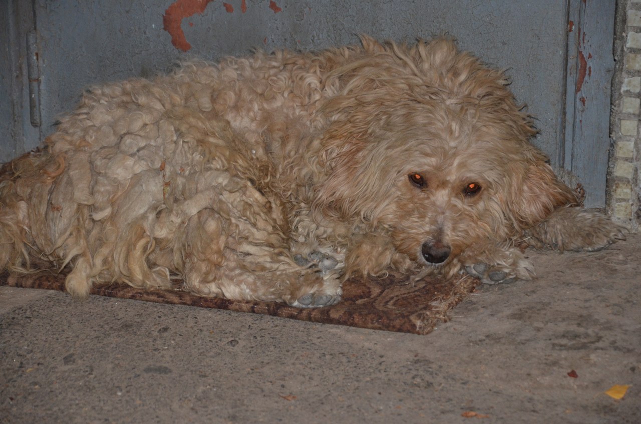 Собаке 3-4 года., его выкинули на дачах и уехали,добрая бабушка которая его нашла , привела к дому,и теперь он живет на коврике у подъезда(в дождь/ливень/грозу/мороз и т.д) а он на коврике лежит( Его даже в подьезд не пускают(