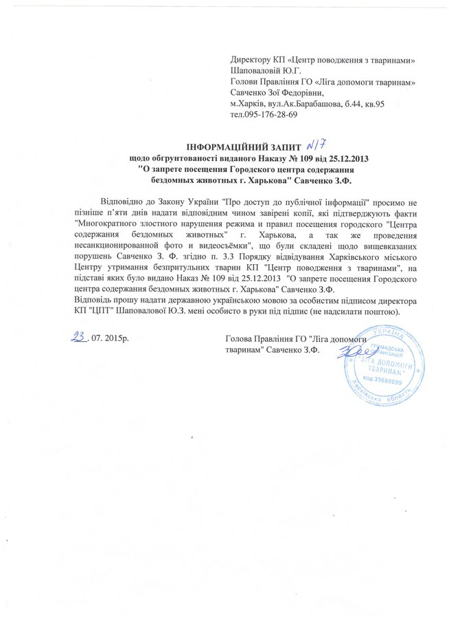 3. Небажання співпрацювати з зоозахисниками та волонтерами. Про недопуск на територію КП голови правління ГО "Ліга допомоги тваринам" Савченко З.Ф. та директора ХБОЗТ "Центр усиновлення тварин" Ратнікової фон-Зассе О.М. є Наказ №109, виданий директором КП "ЦПТ" Шаповаловою Ю.Г.