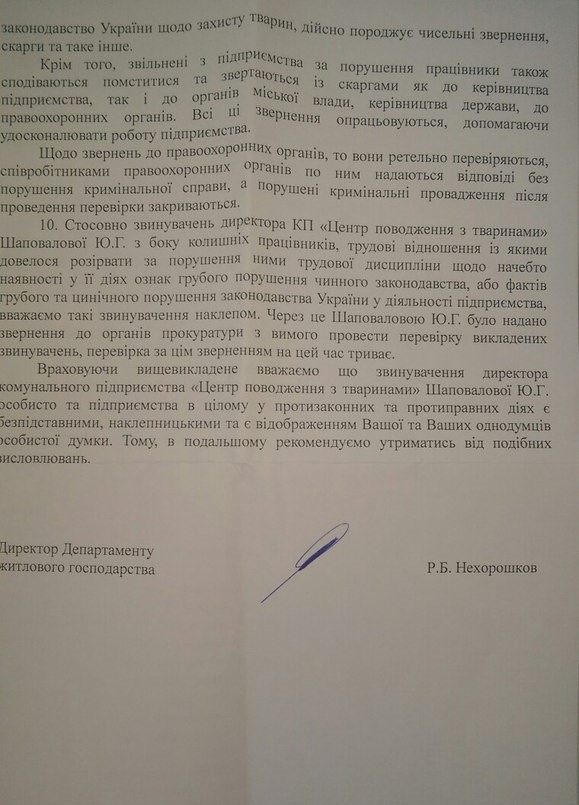 На численні скарги до міськради з приводу незадовільної діяльності КП "ЦПТ" та порушення комунальниками норм діючого законодавства України ми отримуємо корумповані відповіді, з яких видно, що чиновники міськради не бажають проводити перевірки діяльності КП, і не лише закривають очі на все, що там відбувається, а й самі всіляко сприяють порушенням, "кришуючи" живодерів. Ось, наприклад, відповідь директора Департаменту житлового господарства Р. Нехорошкова на нашу скаргу (та копія самої скарги)