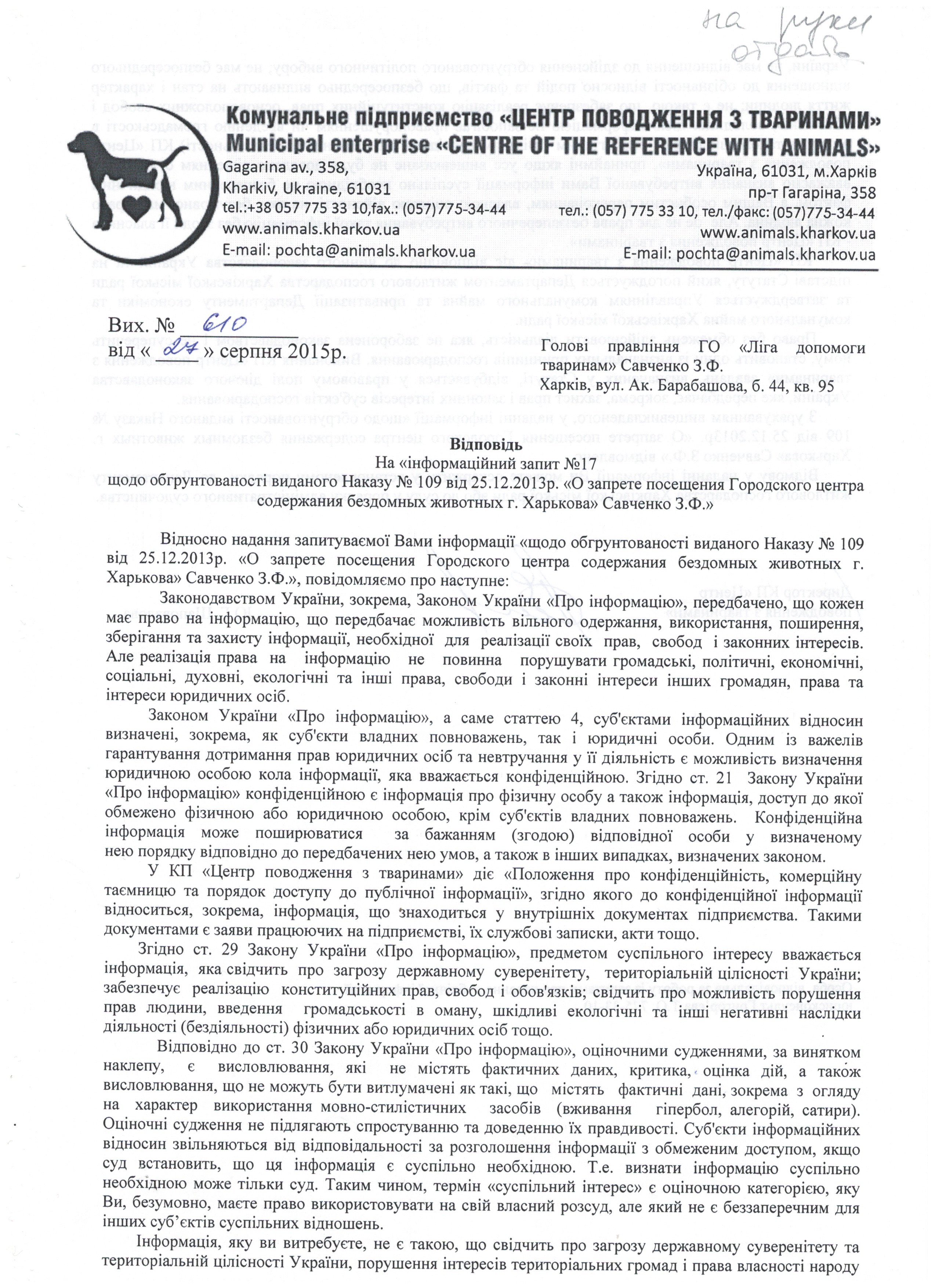 3. Небажання співпрацювати з зоозахисниками та волонтерами. Про недопуск на територію КП голови правління ГО "Ліга допомоги тваринам" Савченко З.Ф. та директора ХБОЗТ "Центр усиновлення тварин" Ратнікової фон-Зассе О.М. є Наказ №109, виданий директором КП "ЦПТ" Шаповаловою Ю.Г.