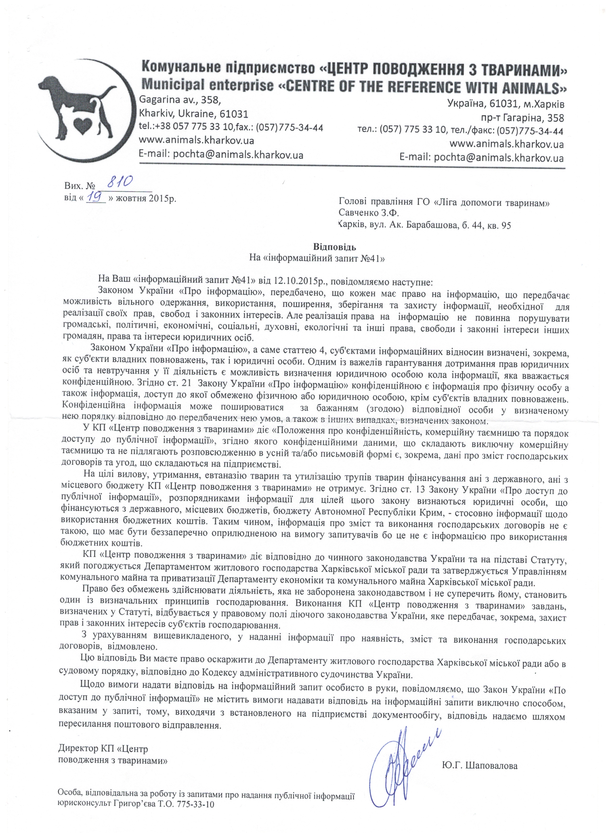 4. Повністю закрита, непрозора діяльність. Відмова в багатьох випадках в наданні запиту на публічну інформацію, а також відповіді щодо обліку кількості тварин, які потрапляють до КП "ЦПТ".