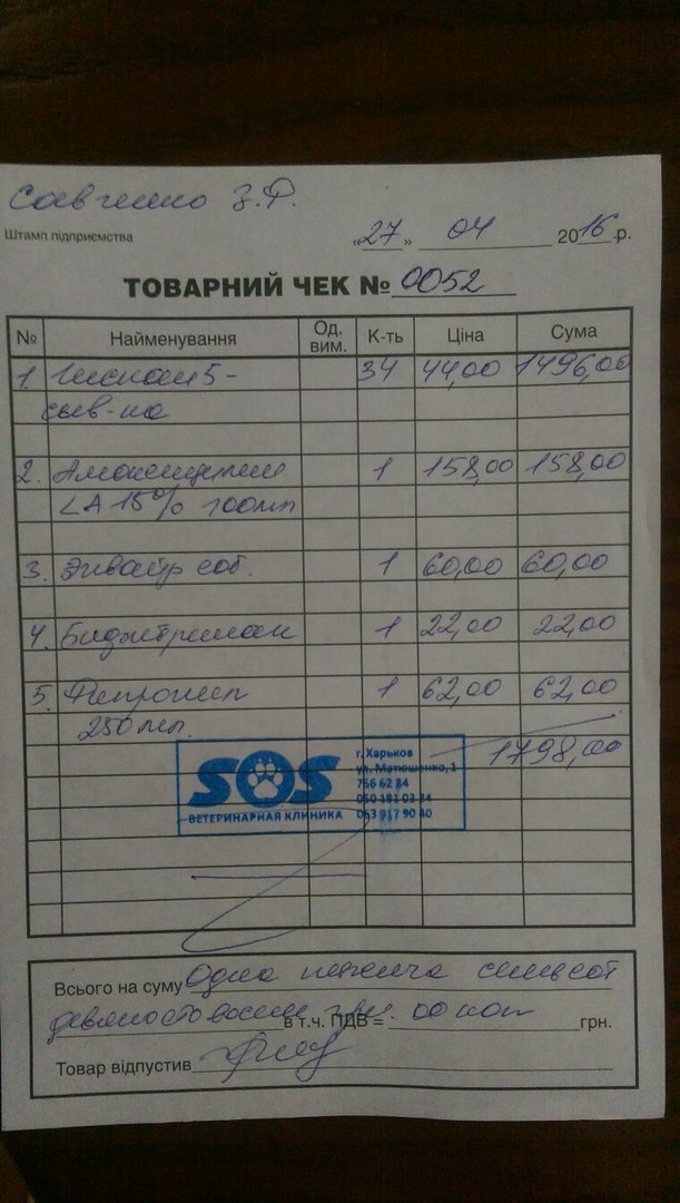 -500грн. передали на лекарства щенкам (Наташа купит лекарства, и выставим чеки).