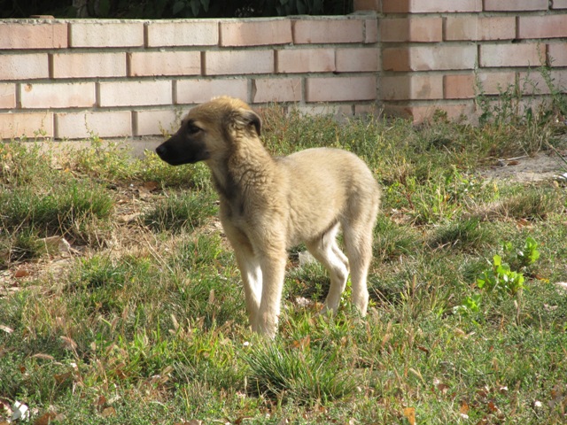 Есть щенок дикий или сильно напуганный. Живет под нерабочим киоском прямо у дороги. В руки не дается.