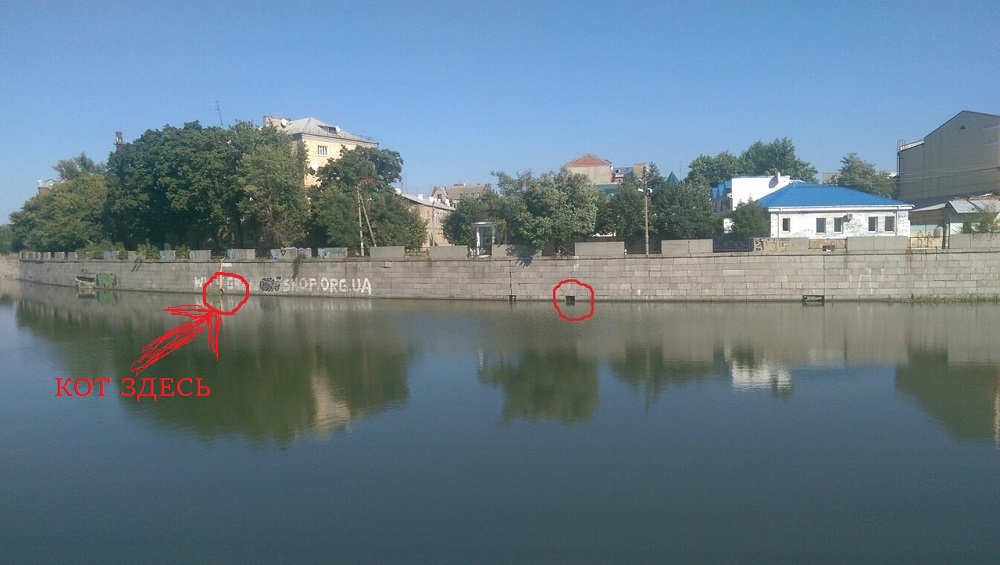 Опекун сообщила, что требуется помощь двум кошкам, которые не могут самостоятельно выбраться из реки на набережной, недалеко от Центрального универмага. Каким-то образом они упали вниз и сидят на сливных трубах, окружённых водой. Вверх они подняться не могут, так как набережная облицована отвесными плитами, высотой около 4 метров. С трубы они тоже не могут уйти - некуда. Кошки или сидят на трубе, или прячутся в трубу. Сначала опекун обнаружила белого с чёрным кота, а потом и кошку на другой трубе в 20 метрах от него. Как они туда попали и сколько времени они там находятся - ей выяснить не удалось, известно только, что к коту подплывали на катере с целью спасти его, но он испугался звука и спрятался в трубу, откуда его невозможно достать. К ним можно подплыть на лодке, взяв её в прокате возле Центрального универмага ( стоимость поката 30 грн за одного человека). Сама женщина не может этого сделать в силу возраста и отсутствия навыков гребли, да и сложно одной. Нужны молодые, ловкие люди и, желательно двое или трое.