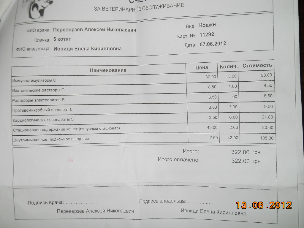 Суммы подсчитала только с сохранившихся чеков, кроме этого были куплены ещё пелёнки на сумму 138 грн. консервы рековери и другой корм, всего уже не помню. Завтра скорее всего будем забирать котят, они ещё слабенькие, но более менее стабильные. Долечивать будем дома. Лечение в клинике конечно надёжней, да и дома более менее стабильные котята, которых нужно куда-то отделить, но финансово продолжать лечение в клинике нет возможности. Завтра нужно окончательно рассчитаться с клиникой.
