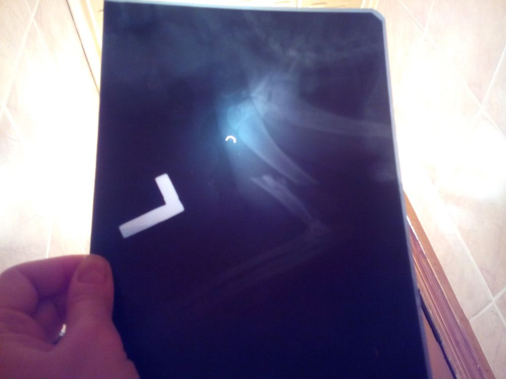 Сначала кот был осмотрен в ближайшей ветклинике "Айболит" дежурным врачом - сделали рентген и оказалось, что у кота перелом левой передней лапки со смещением.