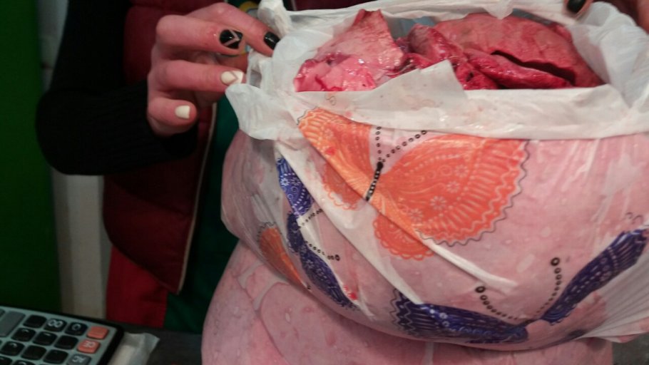 Купила в приют 2 мешка крупы на Центральном рынке (2 * 150 грн = 300 грн). Из мясного передала от себя говяжьих обрезков для бульона и купила говяжьего лёгкого 5,41 кг * 19,90 грн = 107,66 грн и куриной печени 5,93 кг * 34,29 грн = 203,10 грн. Всего на 300+107,66+203,10 = 610,76 грн. Чеков в мясном магазине не дают, прилагаю фотоотчёт.