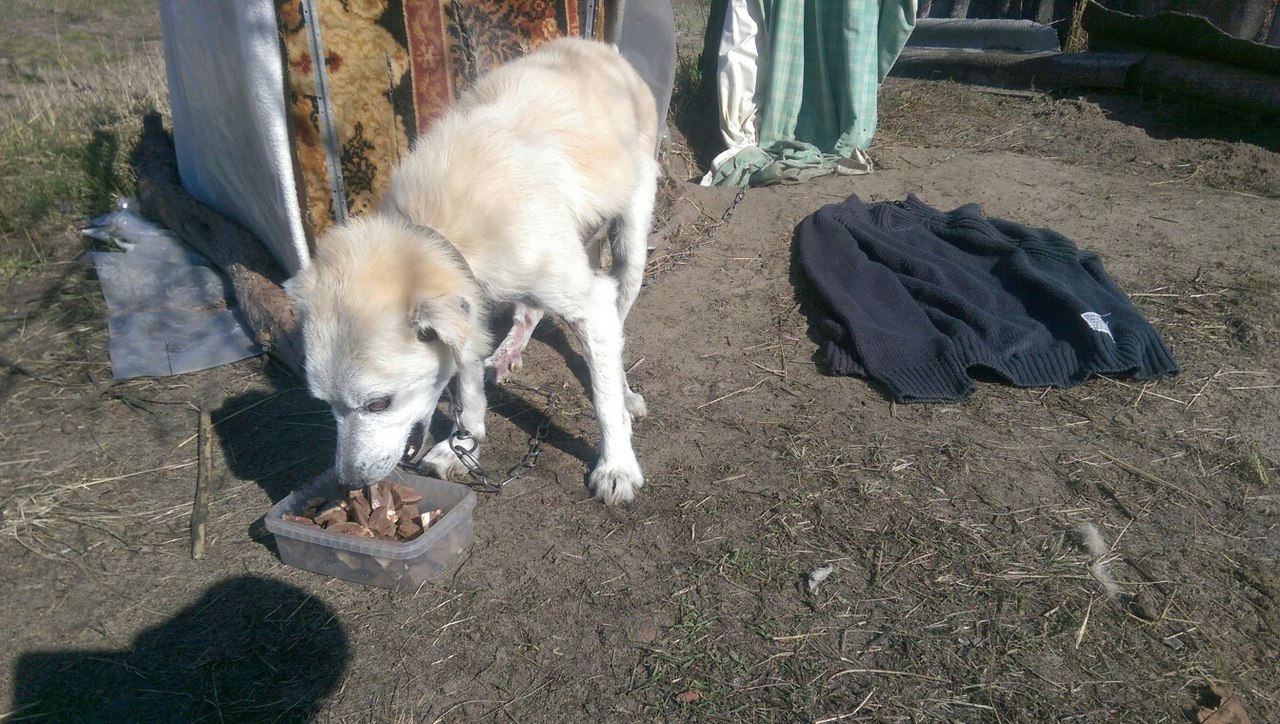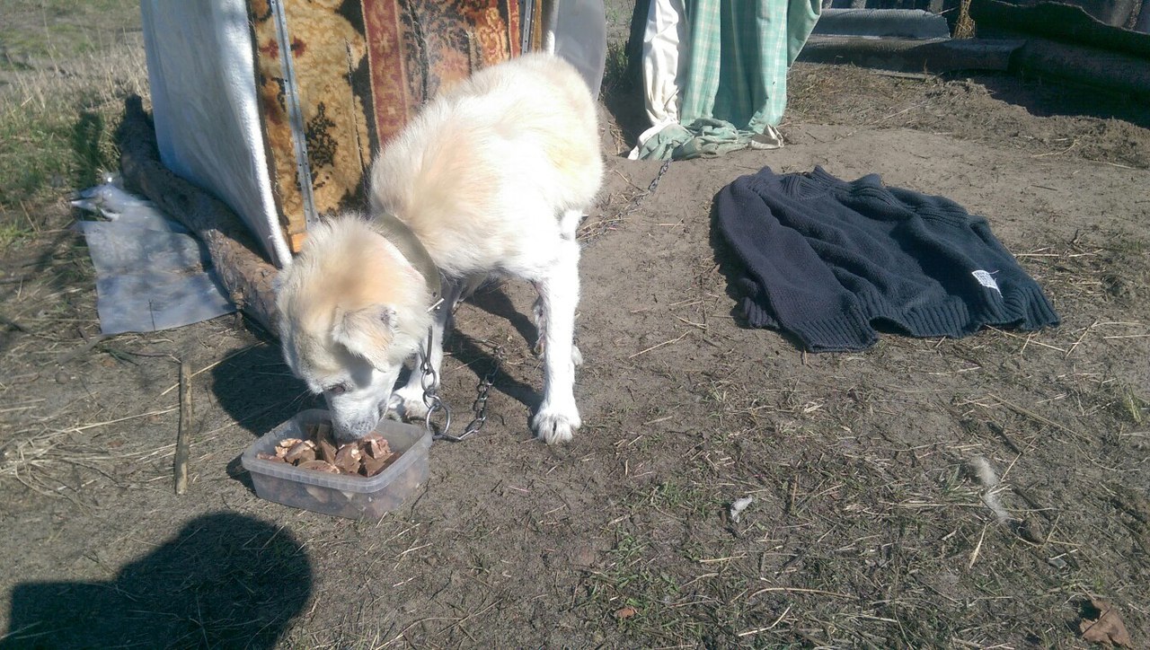 Позавчера ездила к Кнопе. Привезла ей вкусняшку - обезжиренный творог. А также одеяло (купила в Секонде), чтобы она могла возле будочки лежать. Так как с наступлением весны она стала любить лежать на свежем воздухе. (Эти затраты я взяла на себя, в отчёт не вписываю).