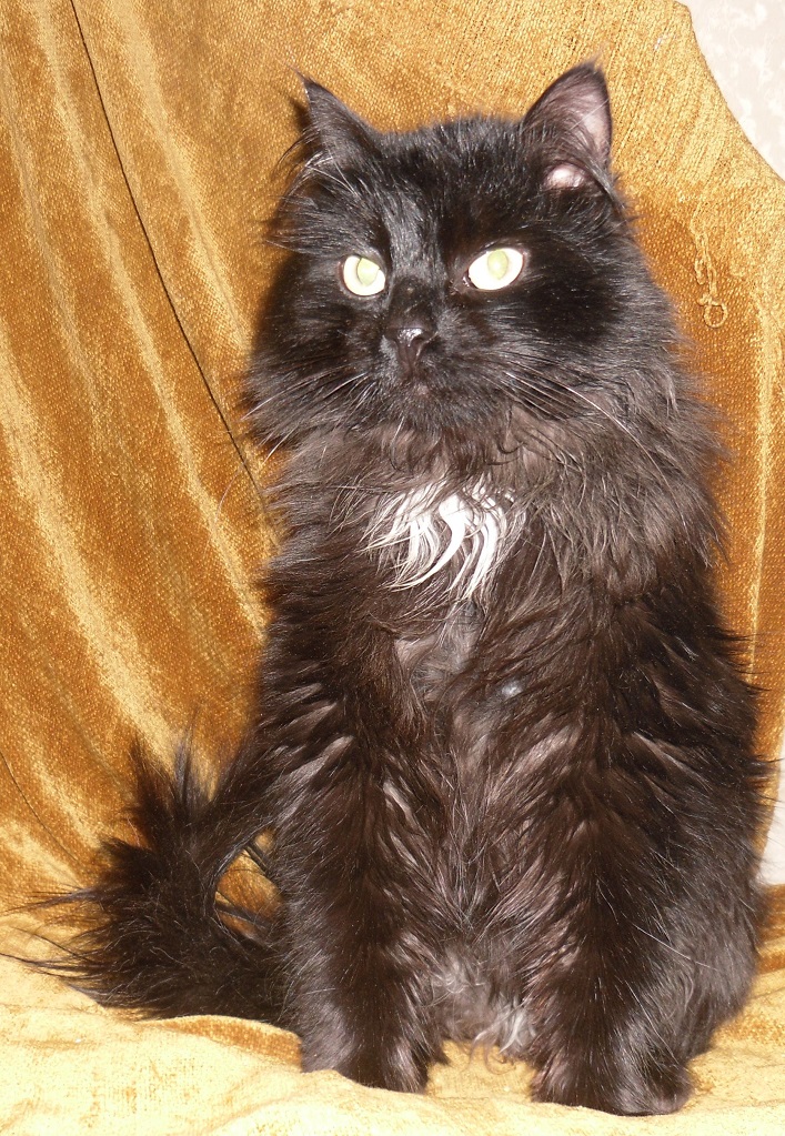 Я решила его забрать, обработать и попытаться найти ему дом, потому что котик перспективный. У него длинная , шелковистая и густая шерсть - на мордочке, спинке и боках смоляно-черная, а животик и воротник дымчатый с белыми волосками. Явно видны признаки персидской породы.
