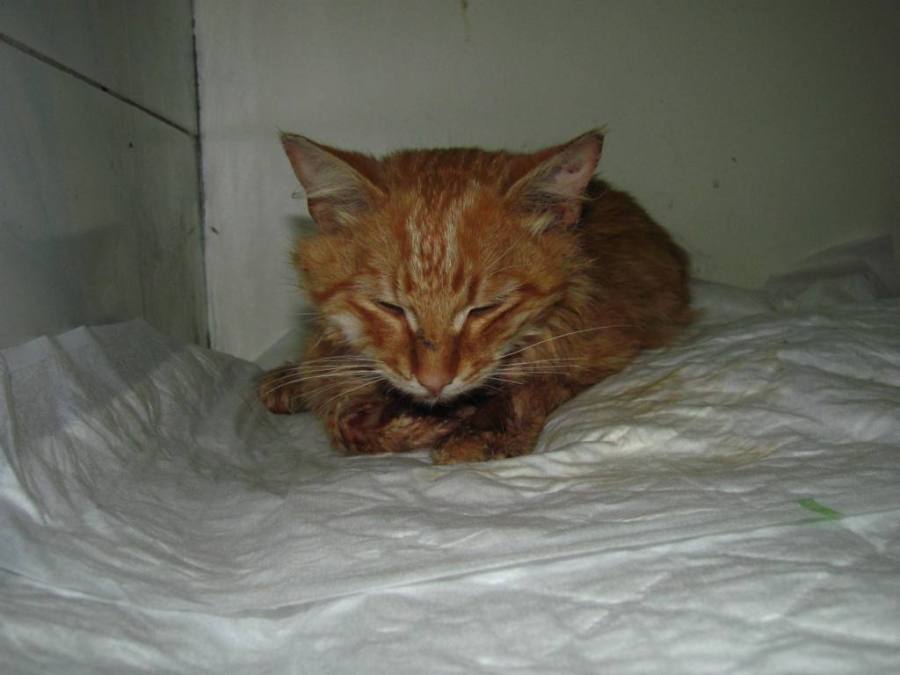 Уже третий день, навещая своего подопечного, мы обращали внимание на рыжего кота, лежащего в клеточке без движения. От него исходил неприятный запах. Оказалось, что его покусали на улице. Сильно прокусана шея и живот (поменьше). Кот все время просто лежал и смотрел на нас. При попытках дотронутся до него, он кричал от боли.
