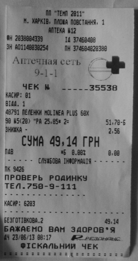 18 июня: купили лекарство цефтриаксон (5 амп.), р-р реосорбилакта - 6 фл. - 173,01 грн.