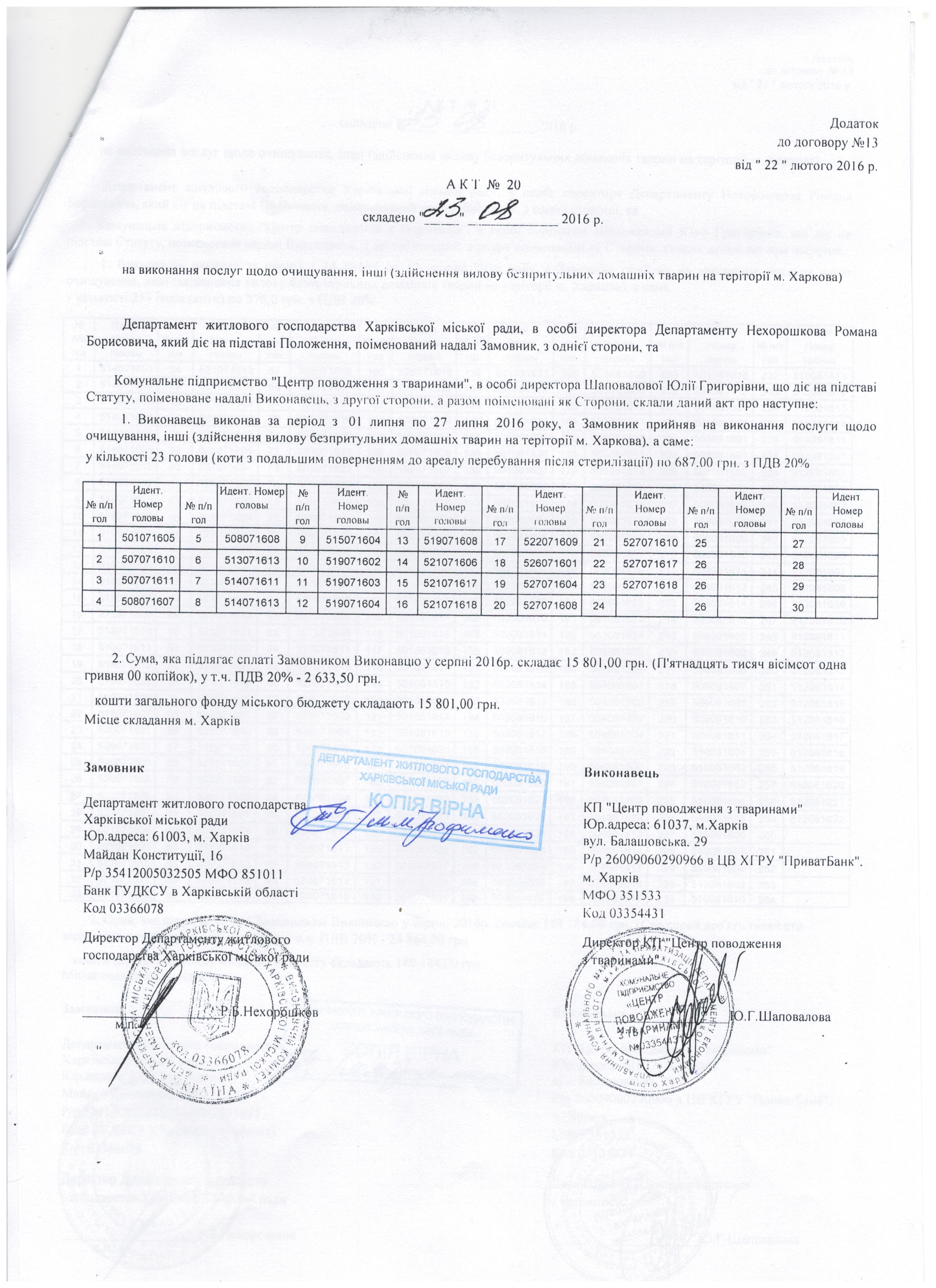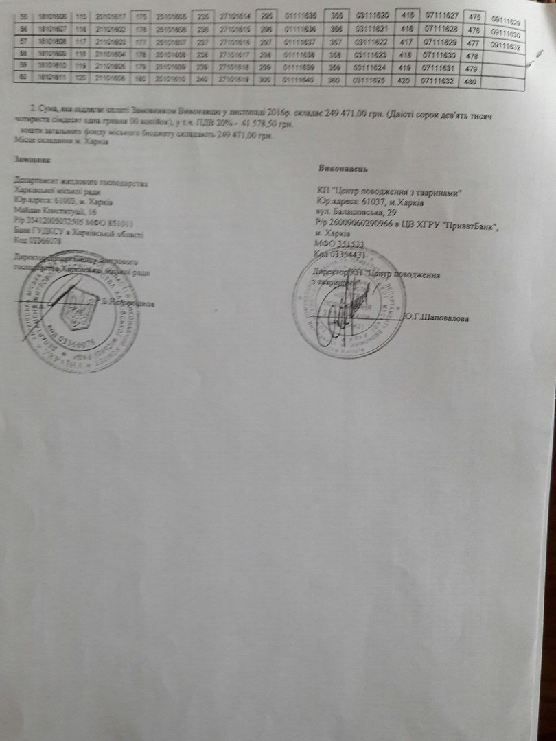 Договор на очистку города от бродячих животных на 2016 год между КП "Центр обращения с животными" и Департаментом жилищного хозяйства Харьковского городского совета, а также Акты приёма выполненных работ (по отлову животных на улицах Харькова). Каждый номер - это жизнь, за ним - отловленное живодёрами и убитое в КП "ЦОЖ" животное.