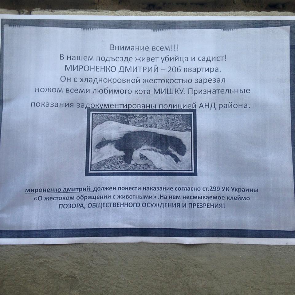 Мироненко Дмитрий зарезал кота по имени Мишка,