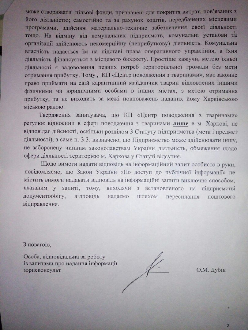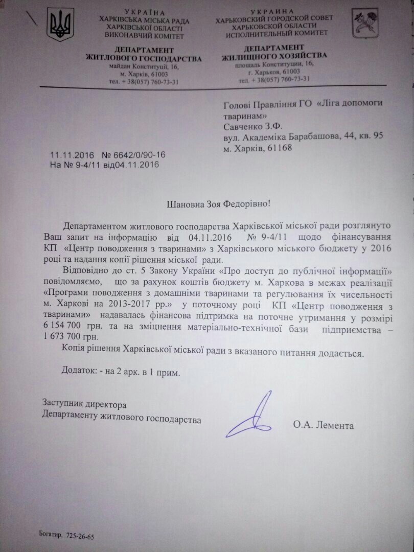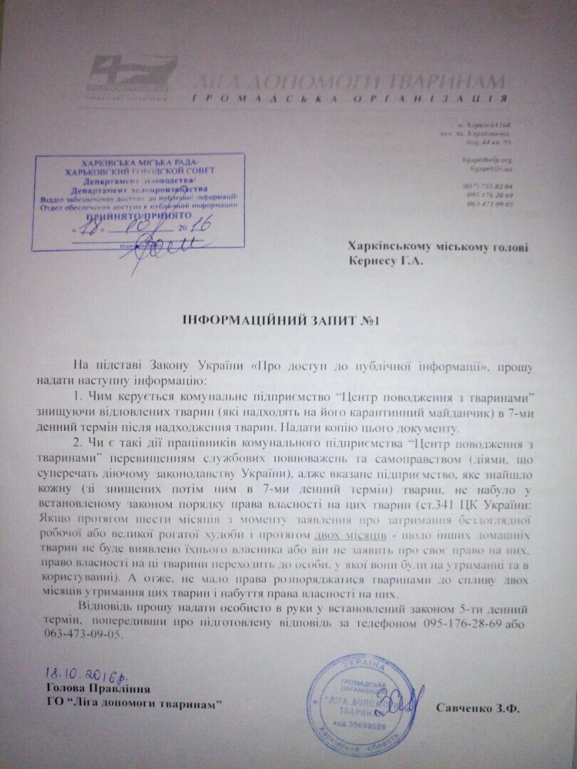 Также подали запрос в Харьковский горсовет по поводу финансирования КП "ЦОЖ" в 2016 году, строительства колумбария, а также попросили дать копии актов выполненных работ между Департаментом жилищного хозяйства Харьковского горсовета и КП "ЦОЖ" (по отлову).