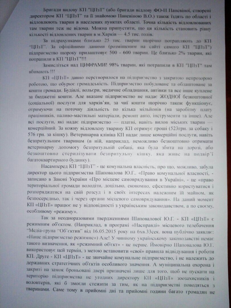 На підставі викладеного прошу шановного голову і шановних депутатів Запорізької міської ради звернути увагу на незадовільну роботу КП «ЦПзТ», численні порушення ним чинного українського законодавства, а також на невідповідність їх діяльності меті гуманного поводження з тваринами для якої вони в першу чергу створювалися.