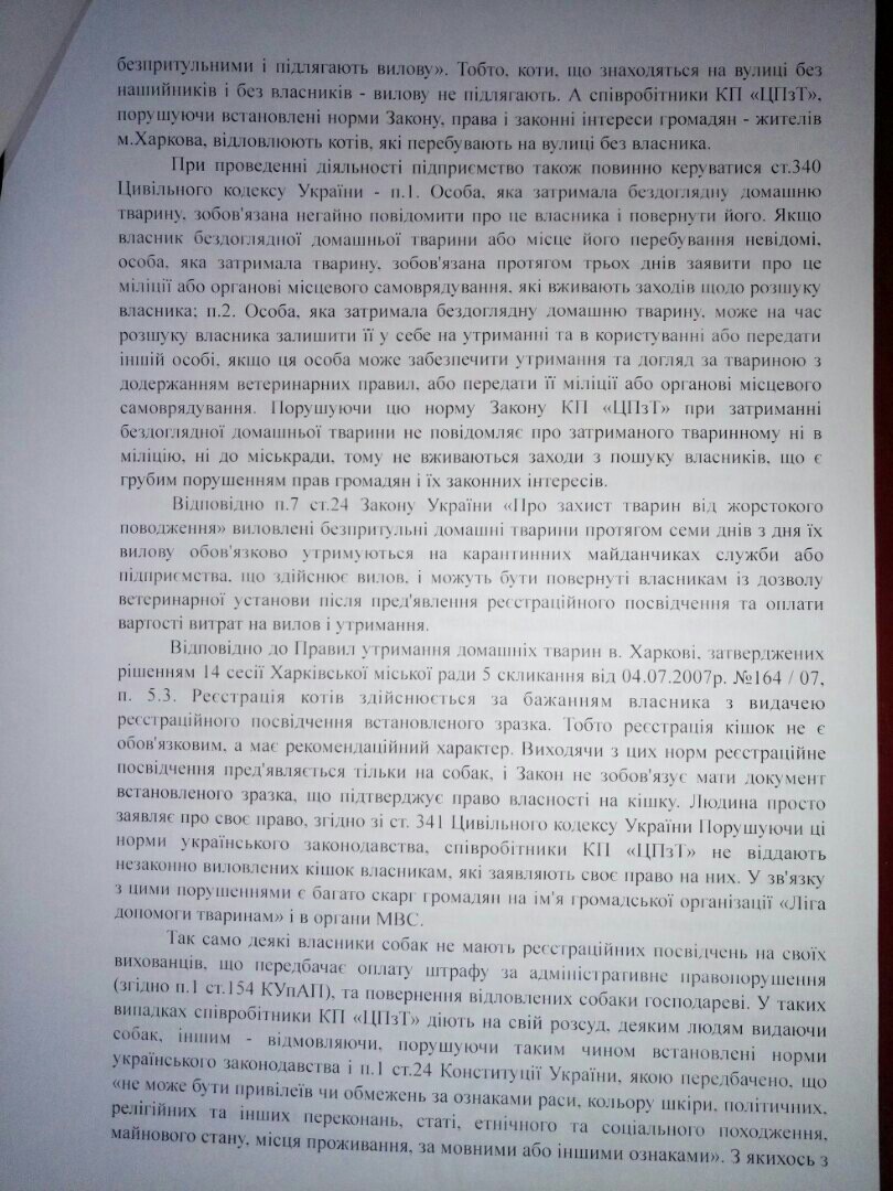 Також Законом України «Про захист тварин від жорстокого поводження» не передбачений вилов котів, тим більше немає інструменту визначення безпритульних котів. П.1 ст.24 зазначеного Закону передбачено вилов виключно собак, а саме: «Собаки, незалежно від породи, належності та призначення, у тому числі і що мають нашийники з номерними знаками і намордники, але знаходяться без власника на вулицях, площах, ринках, в скверах, садах, на бульварах, пляжах, у громадському транспорті, дворах та інших громадських місцях, вважаються безпритульними і підлягають вилову». Тобто, коти, що знаходяться на вулиці без нашийників і без власників - вилову не підлягають. А співробітники КП «ЦПзТ», порушуючи встановлені норми Закону, права і законні інтереси громадян - жителів м.Харкова, відловлюють котів, які перебувають на вулиці без власника.