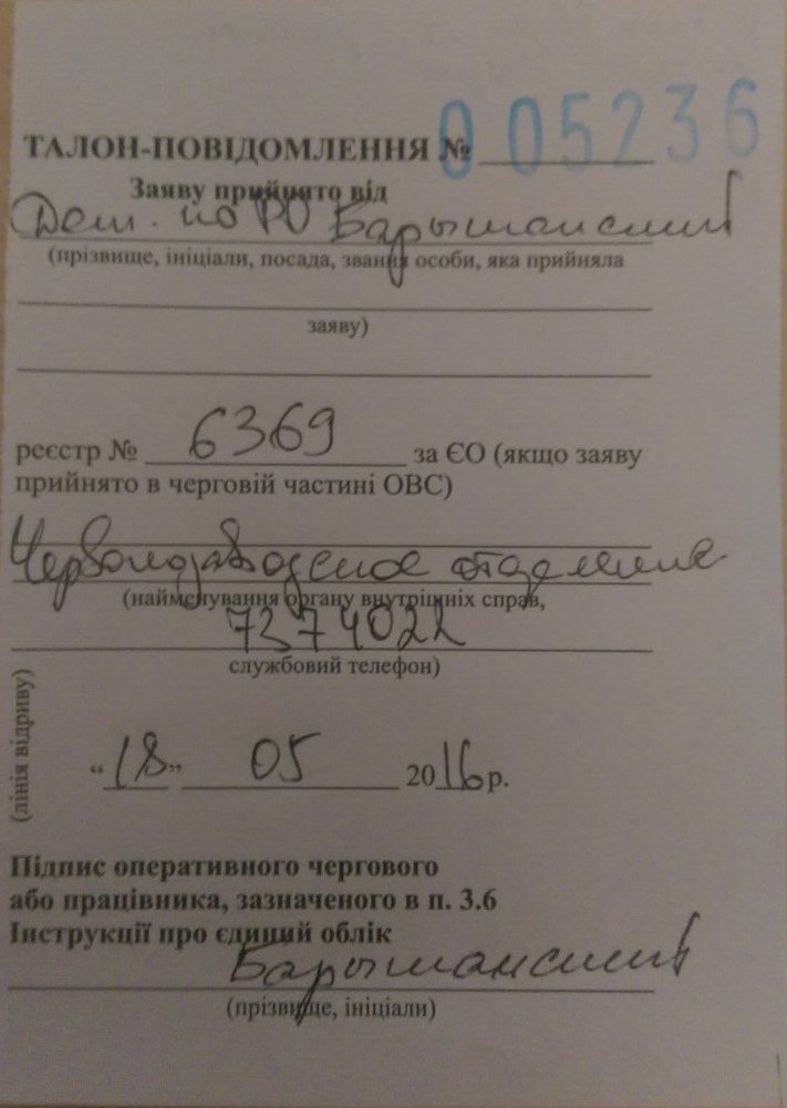 Сегодня ездили с Зоей в налоговую, потом в Червонозаводской отдел полиции - я забрала талон-уведомление о заявлении, написанном мной в КП "ЦОЖ" 5 мая (по факту незаконно размещённых на проходной КП моей и других активистов фотографий).