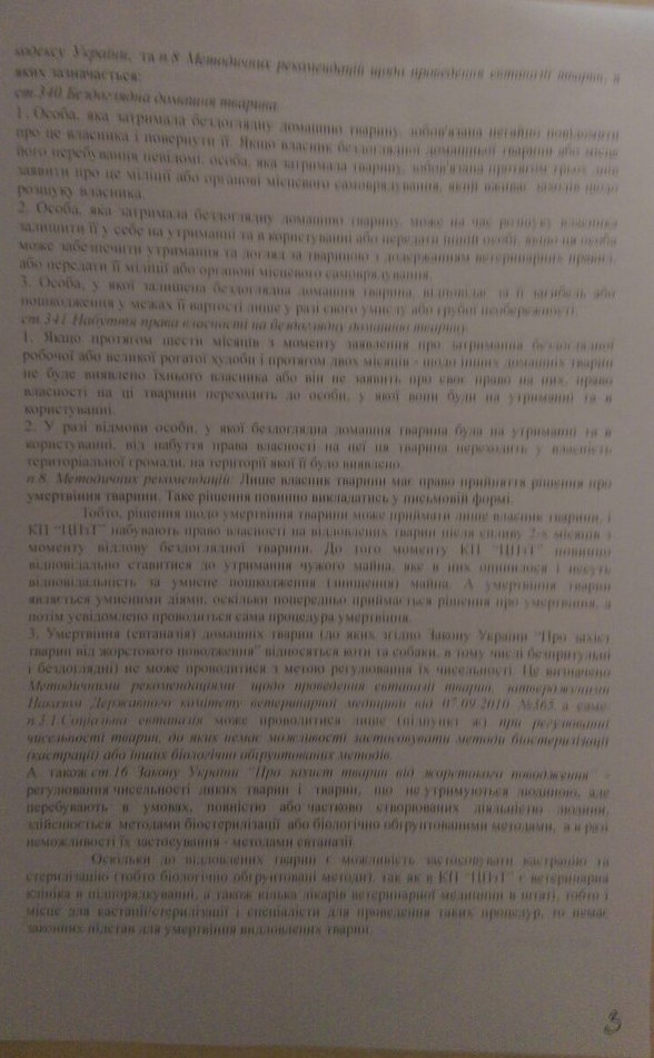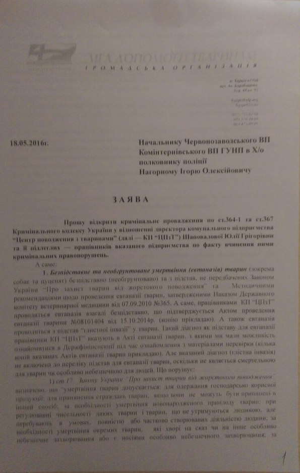 Также мы подали заявление на директора КП "ЦОЖ" Шаповалову Ю.Г. по факту незаконной эвтаназии животных и умышленного уничтожения чужого имущества.