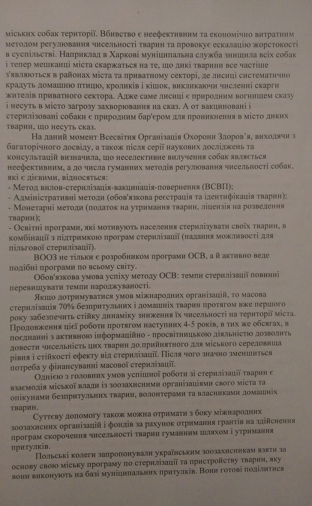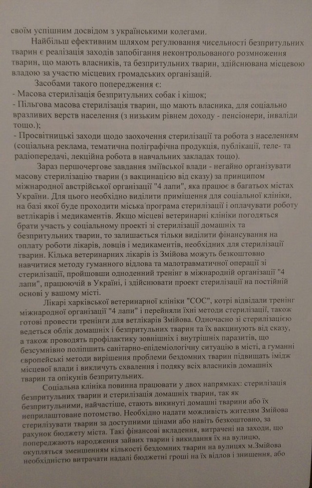 Мы привезли с собой письмо - обращение к мэру Змеёва с нашими предложениями по регулированию численности животных и решили передать его лично в руки, а заодно и поговорить с ним о проблеме бездомных животных и методах её решения в областных городах. К сожалению, мэра на месте не было, но наше письмо с предложениями мы официально зарегистрировали в мэрии.