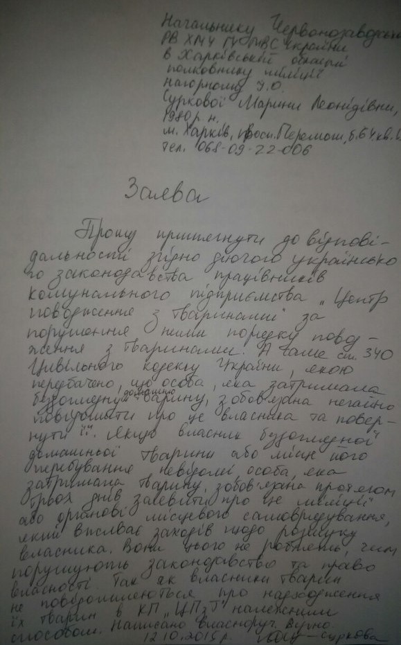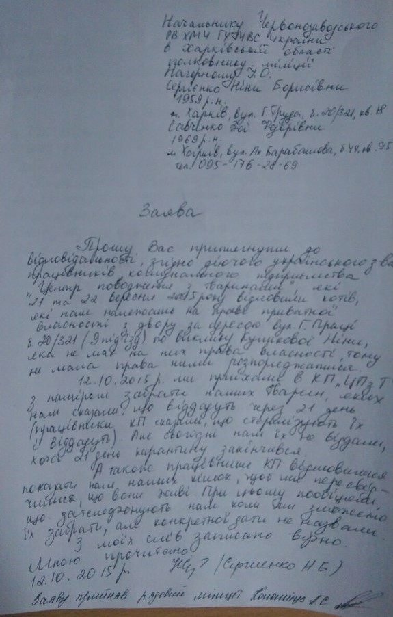 После суда мы сходили на консультацию к доктору юридических наук. Потом встретились с Антониной Васильевной Усиченко, у которой кпшники забрали домашних кошек и не вернули и подали с ней ещё одно заявление, но теперь уже в полицию: viewtopic.php?f=26&t=9598&start=150
