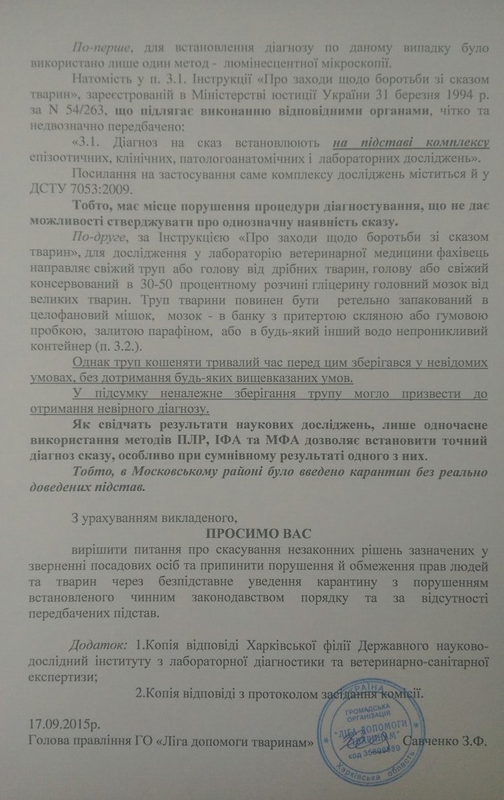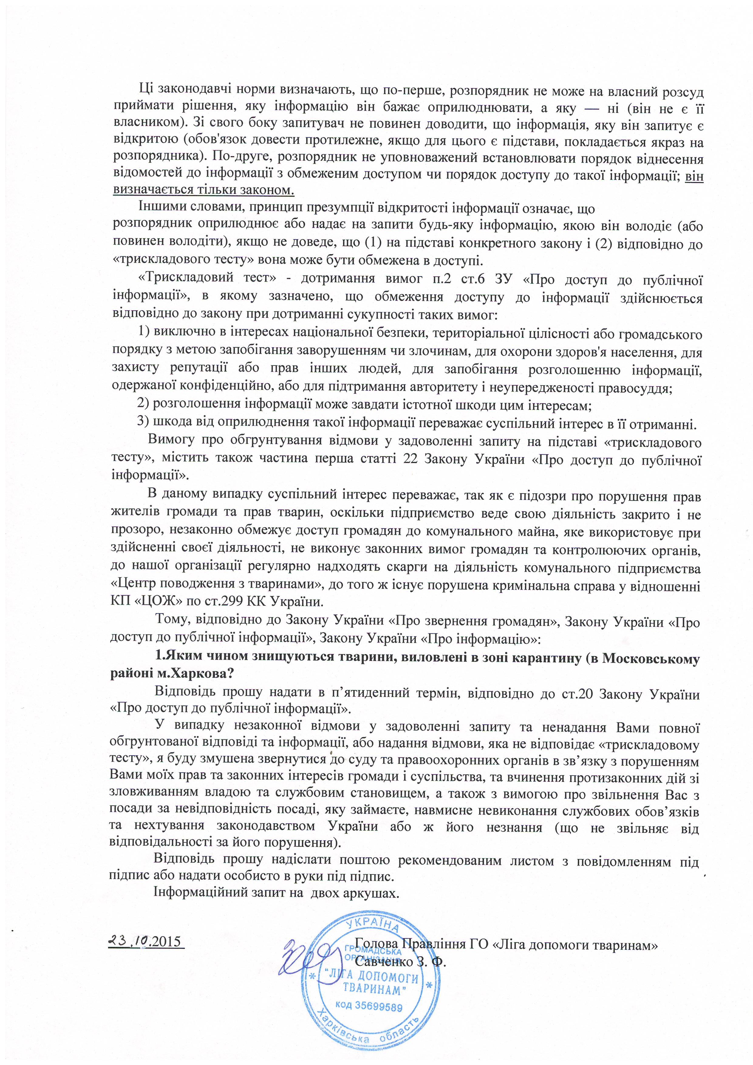 Заява від 21.08.2015р. з вимогою припинити незаконний вилов котів та їх умертвіння (евтаназію) працівниками комунального підприємства «Центр поводження з тваринами» в Московському районі м.Харкова (районі карантину), оскільки такі дії працівників проводяться без попередження, що порушує встановлені норми законодавства. Також вони порушують право власності, гарантоване Конституцією України та Цивільним кодексом України. Так як в Конституції України та діючому українському законодавстві не має такої норми, якою б скасовувалося право власності на момент карантину в окремому районі міста. А також не має такої норми закону, згідно якої працівники комунального підприємства «Центр поводження з тваринами» могли б порушувати під час карантину передбачені правила під час вилову (попередження мешканців прибудинкових територій, недопущення жорстокого поводження з тваринами та непорушення права власності). Та вони не звільняються від відповідальності за порушення законодавства України, прав та законних інтересів громадян. Вимагали негайно припинити їх протизаконні дії, які вчиняють працівники комунального підприємства «Центр поводження з тваринами» в Московському районі м.Харкова (районі карантину), для відновлення законних прав та інтересів громадян та попередження рецидивів порушень. Оскільки працівники комунального підприємства «Центр поводження з тваринами» при виконанні своїх обов’язків повинні діяти лише в межах повноважень та у спосіб, визначений законом, та не мають права порушувати визначений законом порядок, права та законні інтереси громадян.