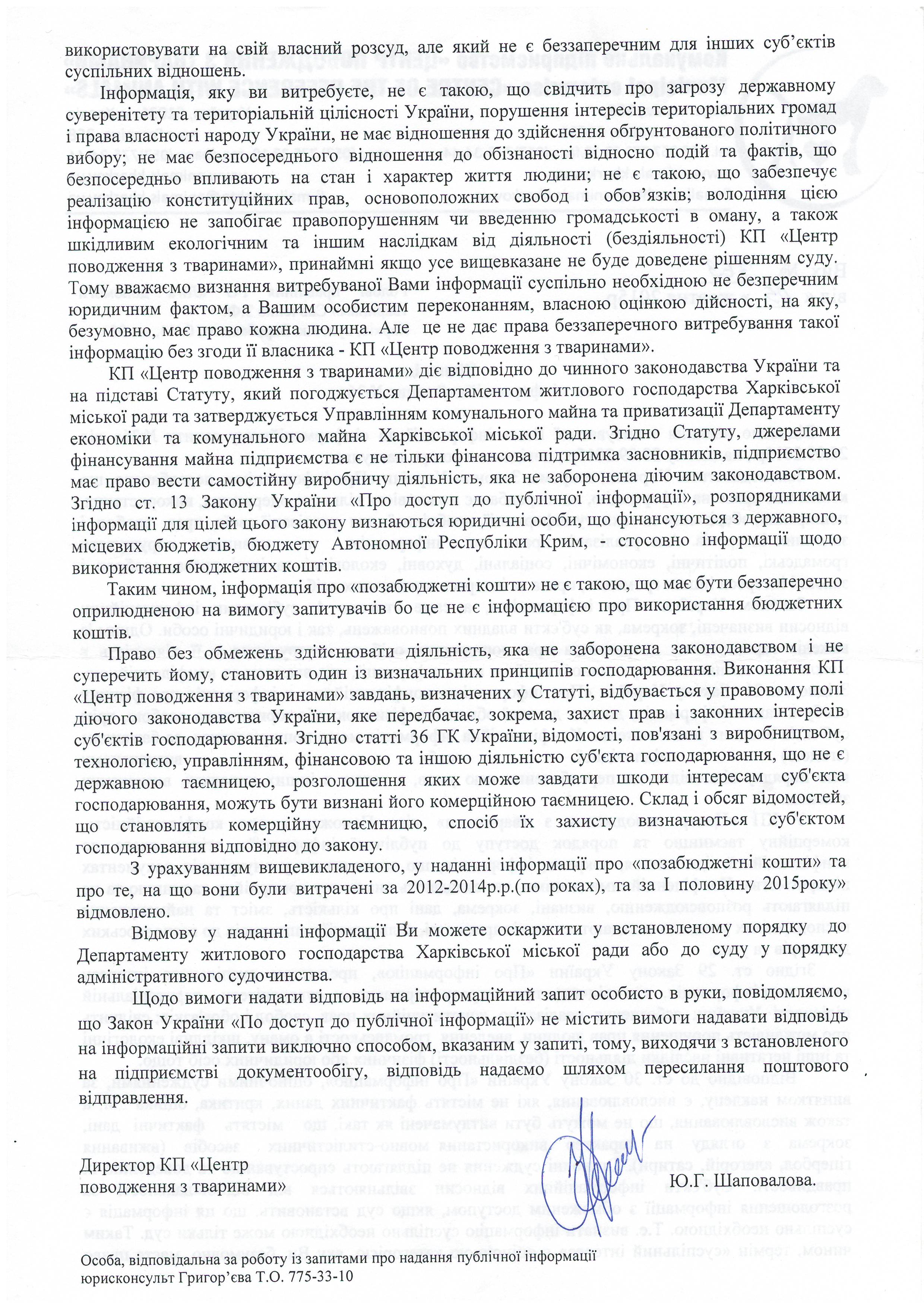 Окреме запитання щодо відмови оприлюднити Положення про відлов тварин. КП «ЦПзТ» здійснює відлов тварин в м.Харкові як особа, уповноважена Харківською міською радою на вчинення таких дій. А Харківська міська рада діє від імені громади Харкова. Більш того: КП «ЦПзТ» є ВЛАСНІСТЮ ГРОМАДИ м.Харкова!!! І фінансується цією громадою. І, як виявилося, приховує інформацію про свою діяльність від свого власника, який її фінансує!!! Це є незаконним і порушує права нашої громади!!!