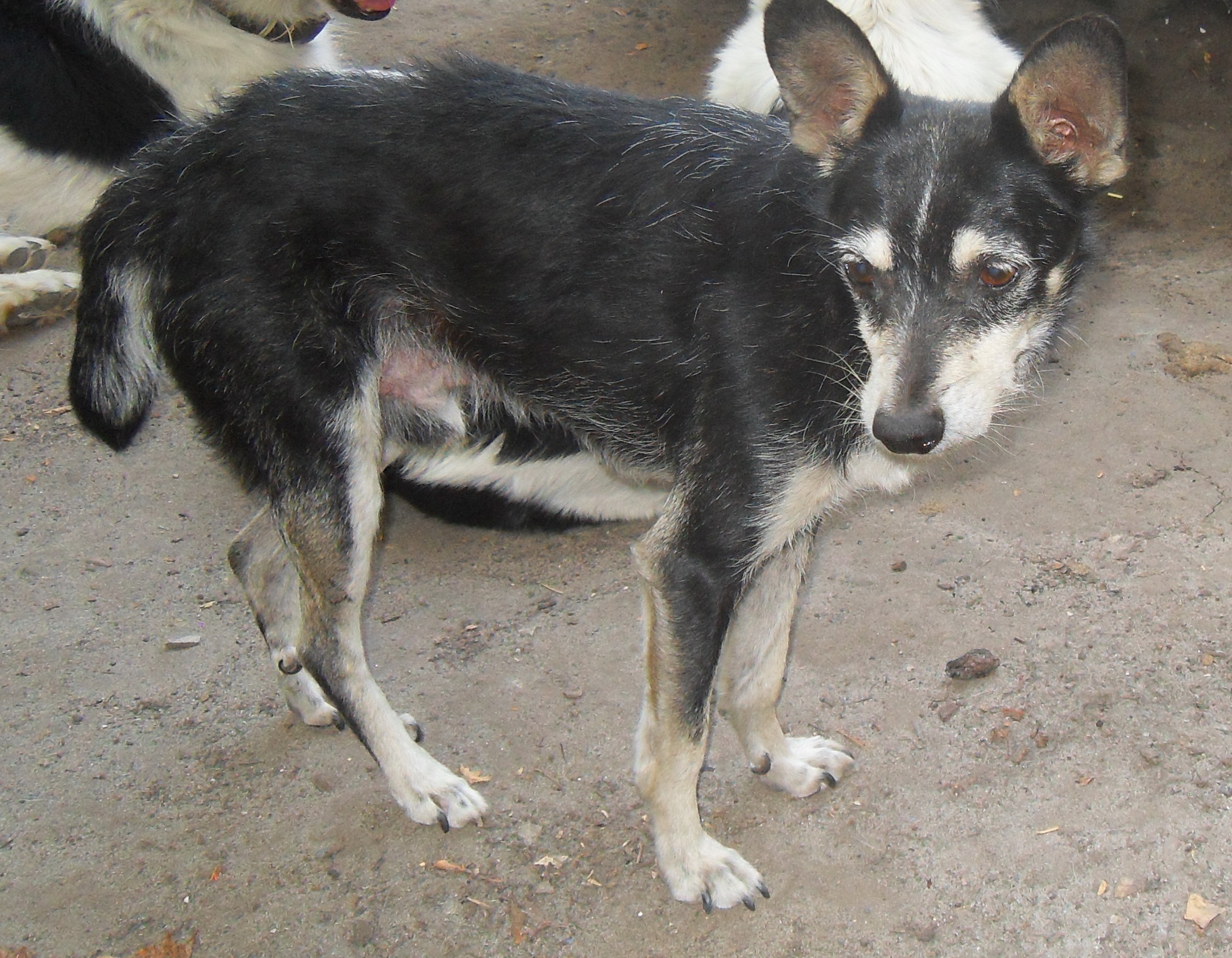 Цвет черный-серый-немного белого. Уши стоят. Хвост короткий, купирован. Тип шерсти – обычная. Боится машин, выстрелов салюта, людей. Был черный ошейник от блох.