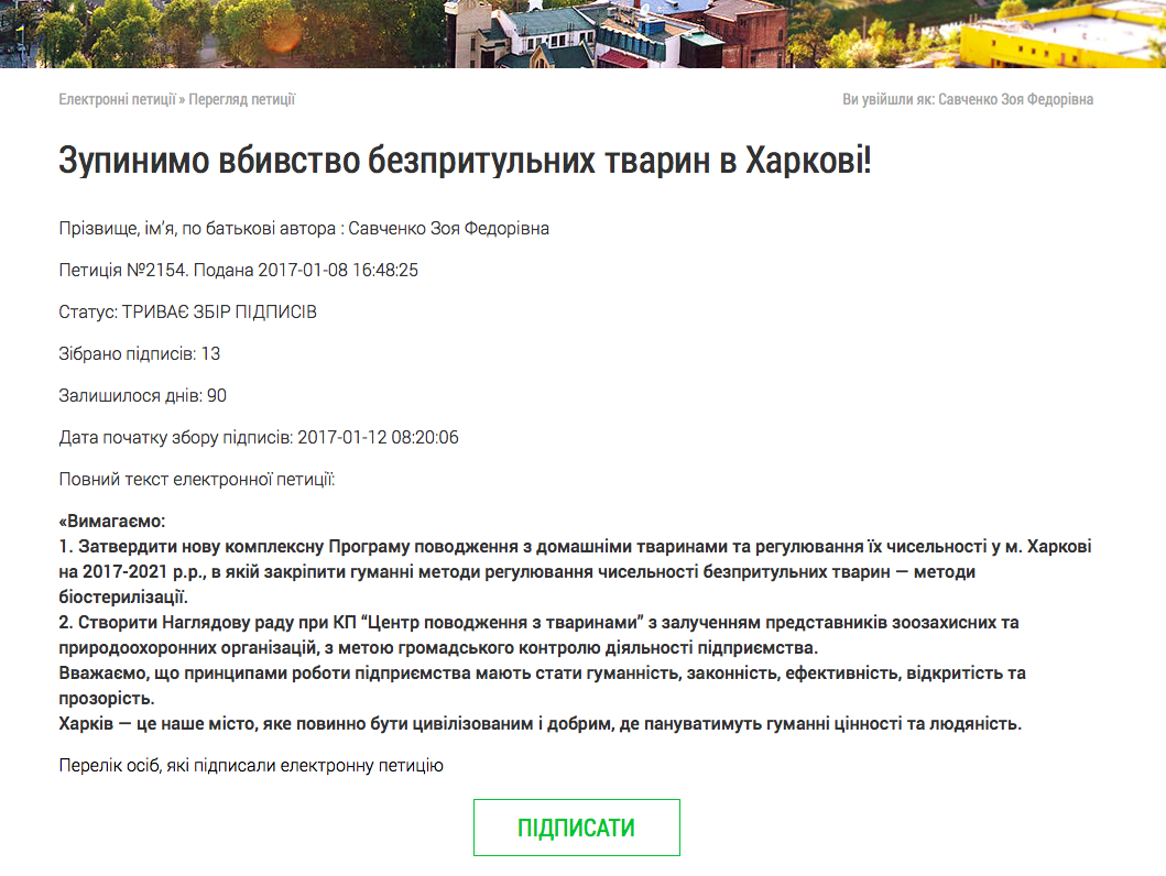Живодёрка выставила на сайте горсовета очередную петицию, под которой подписались все сотрудники живодёрни КП"Центр обращения с животными", догхантеры, а также много сотрудников горсовета, которые, по-видимому, поддерживают живодёров и догхантеров.