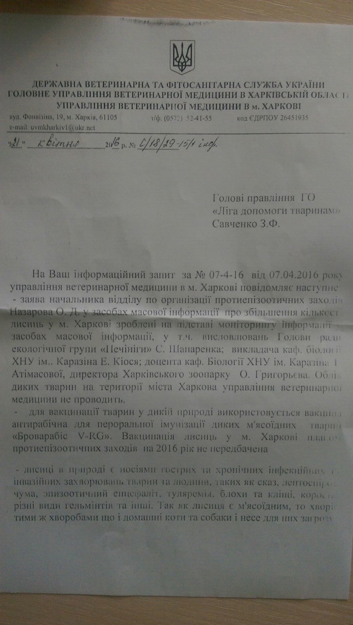 В этом году в Харькове, впрочем как и во всей Украине, создаётся реальная угроза распространения бешенства, не смотря на то, что Шаповалова убила всех бездомных собак и убивает кошек, есть ещё домашние собаки и кошки, которых в этом году не смогли вакцинировать хозяева при всё своём желании, потому что в Харьков прислали из Киева очень мало бесплатных вакцин от бешенства, а вакцинировать по 75 грн. доступно далеко не каждому владельцу- животные малоимущих владельцев, пенсионеров и животные из миниприютов остались в этом году без защиты от бешенства. Так кто виноват в распространении бешенства - животные или люди, работающие в определённых органах, которые создали искусственный дефицит и сорвали в этом году вакцинацию от бешенства. Вот объяснение облветуправления по поводу катастрофической нехватки бесплатных вакцин от бешенства- неизлечимого заболевания, которое необходимо только профилактировать при помощи поголовной вакцинации.