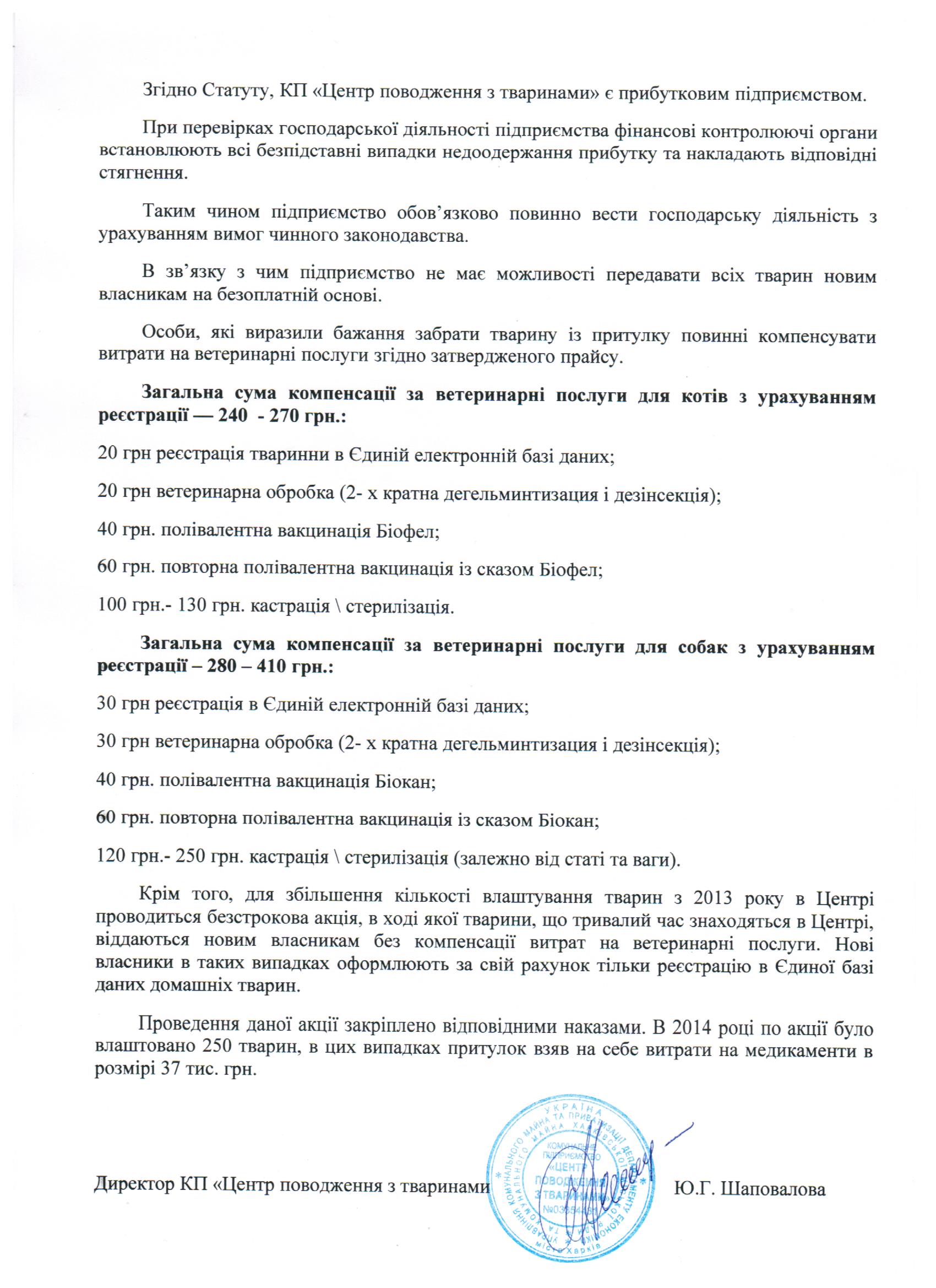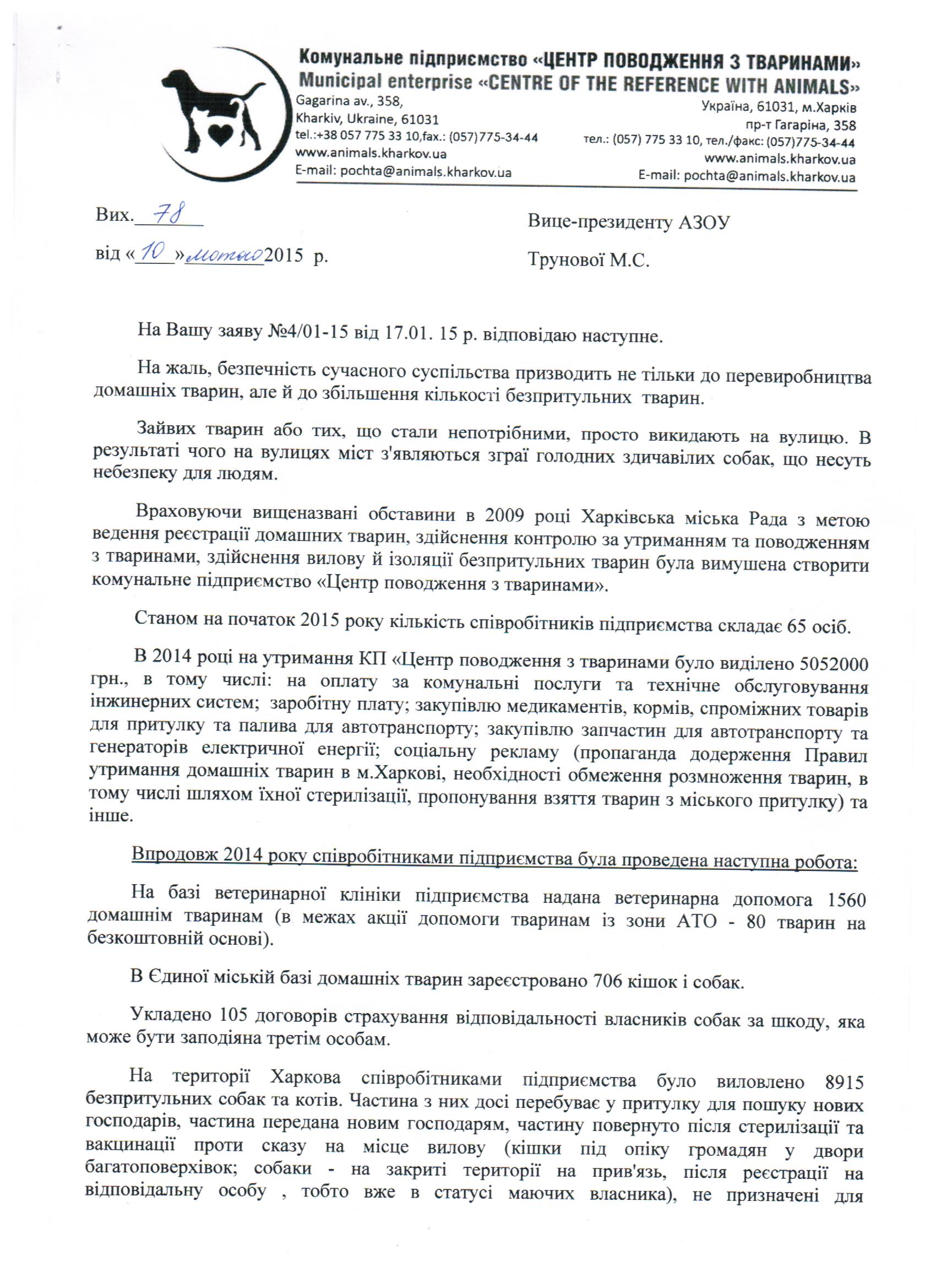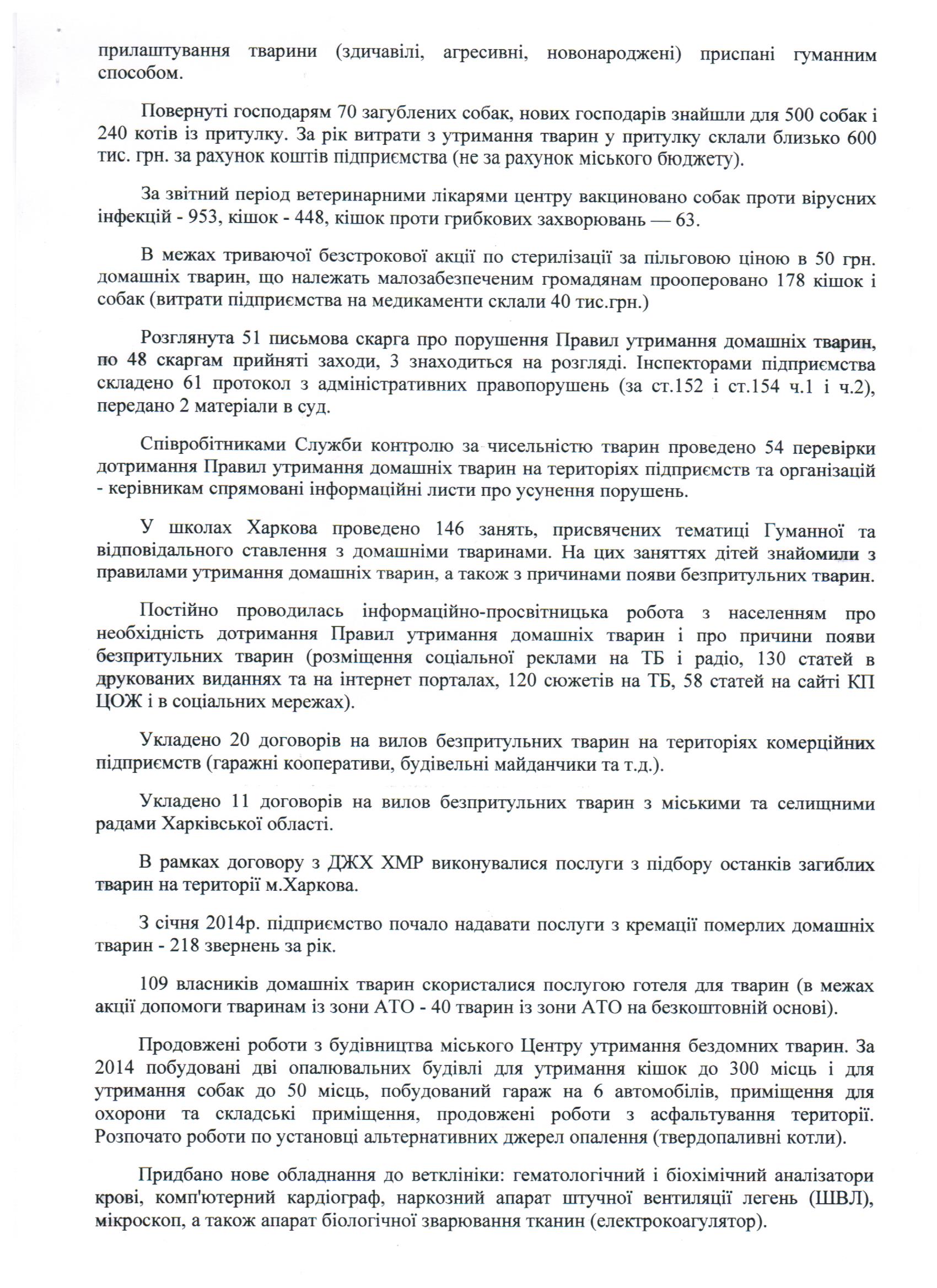 "на базе предприятия оказана помощь 1560 домашним животным". Это чисто коммерческая деятельность КП"ЦОЖ" (это платная ветеринарная помощь) на базе коммерческой ветеринарной клиники при КП"ЦОЖ" и бесплатно здесь никто никого не лечит.