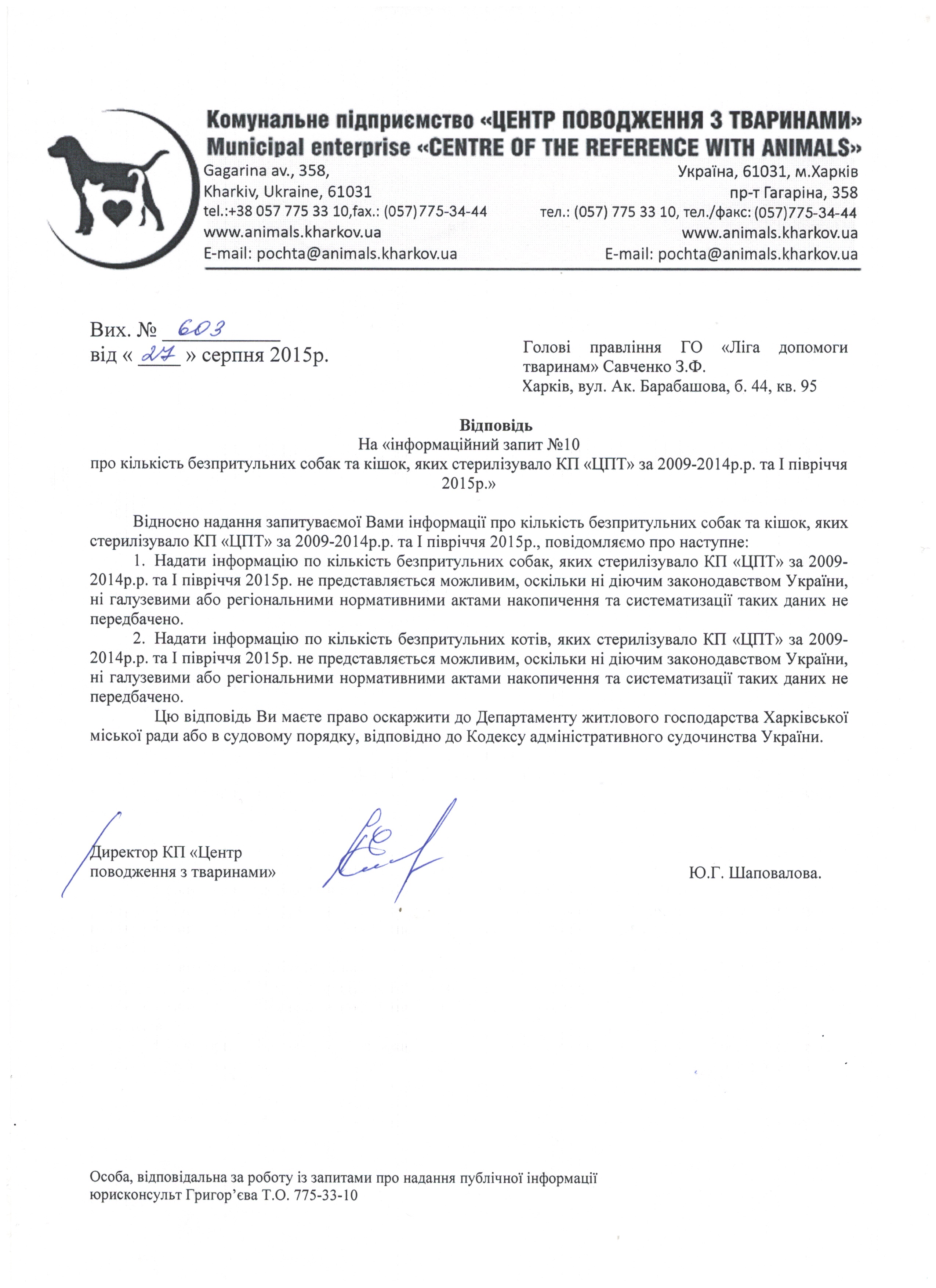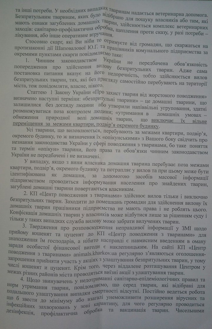 Ми також звернулися до Харківської міської ради, попрохавши надати інформацію чи дійсно КП "ЦПТ" є притулком, і якщо це так, то надати нам копію Положення про притулок, як передбачено діячим законодавством України. На що отримали відповідь, що звернення за належністю надіслано до КП і потім від самого КП "ЦПТ" отримали як завжди відповідь без конкретики. Але яка підтверджує, що КП не являється притулком.