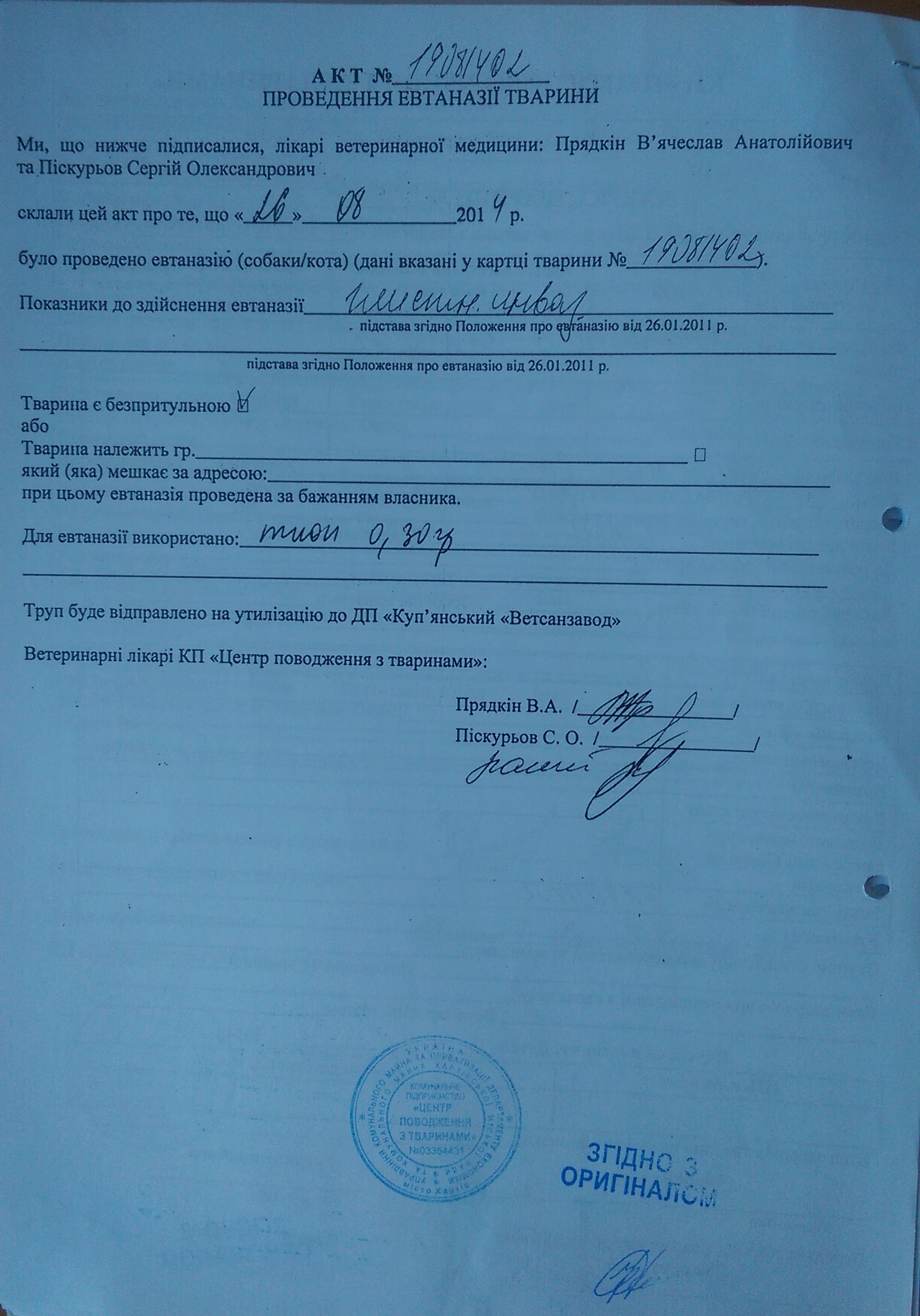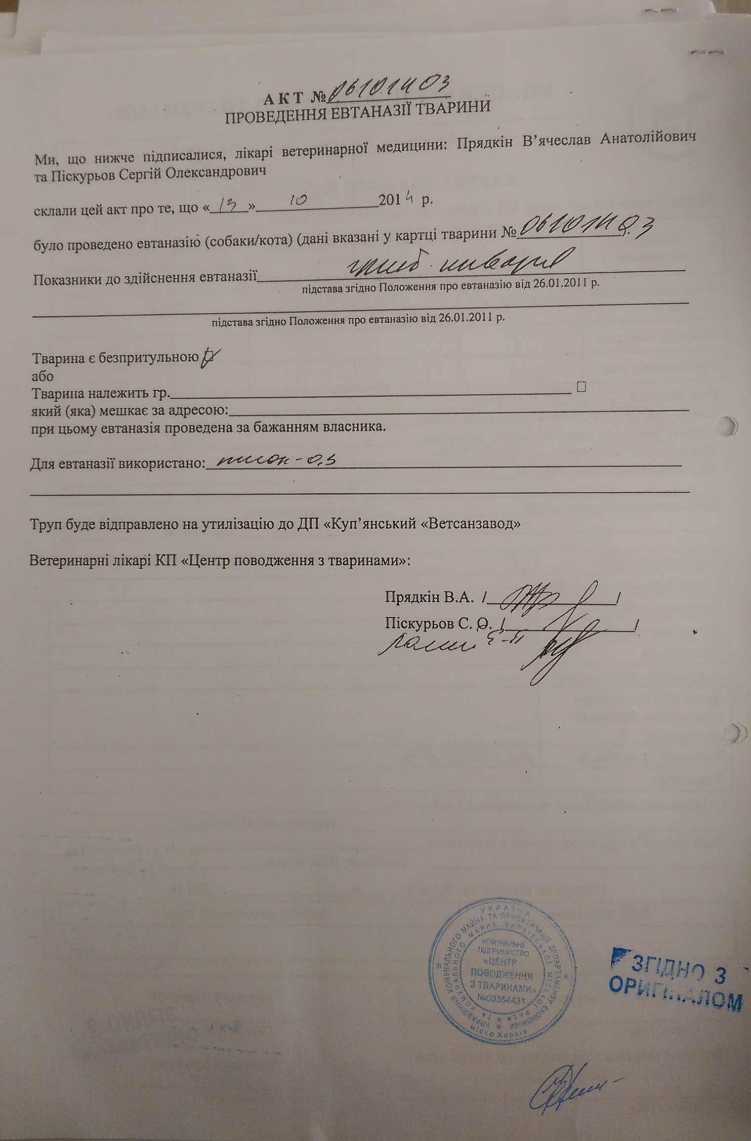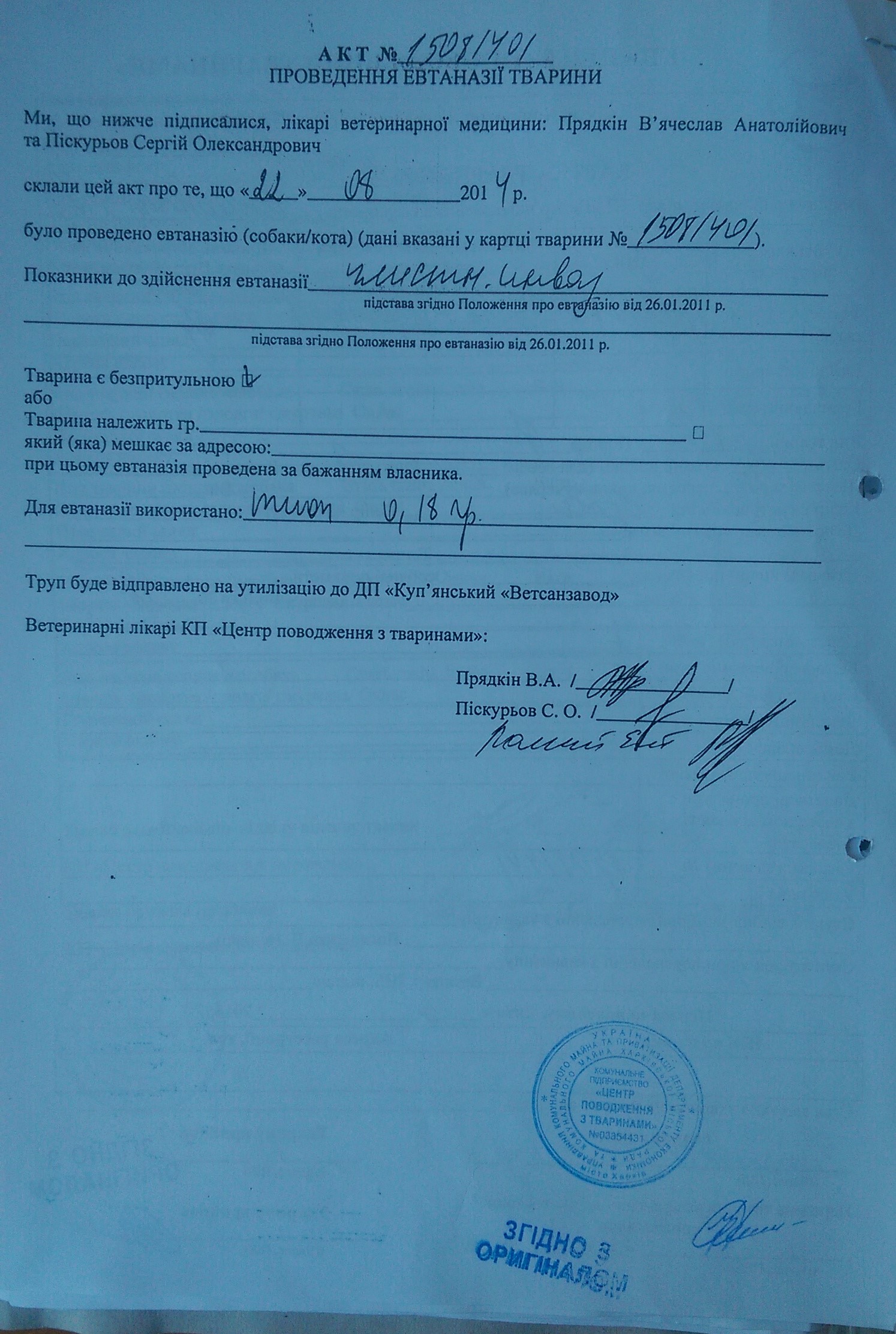 9.І на останок: в КП "ЦПТ" стверджують, що евтаназують лише з певних підстав (ці підстави визначила директор КП "ЦПТ" на власний розсуд, оскільки вони не відповідають підставам, передбаченим ст.17 Закону України "Про захист тварин від жорстокого поводження" http://zakon3.rada.gov.ua/laws/show/3447-15