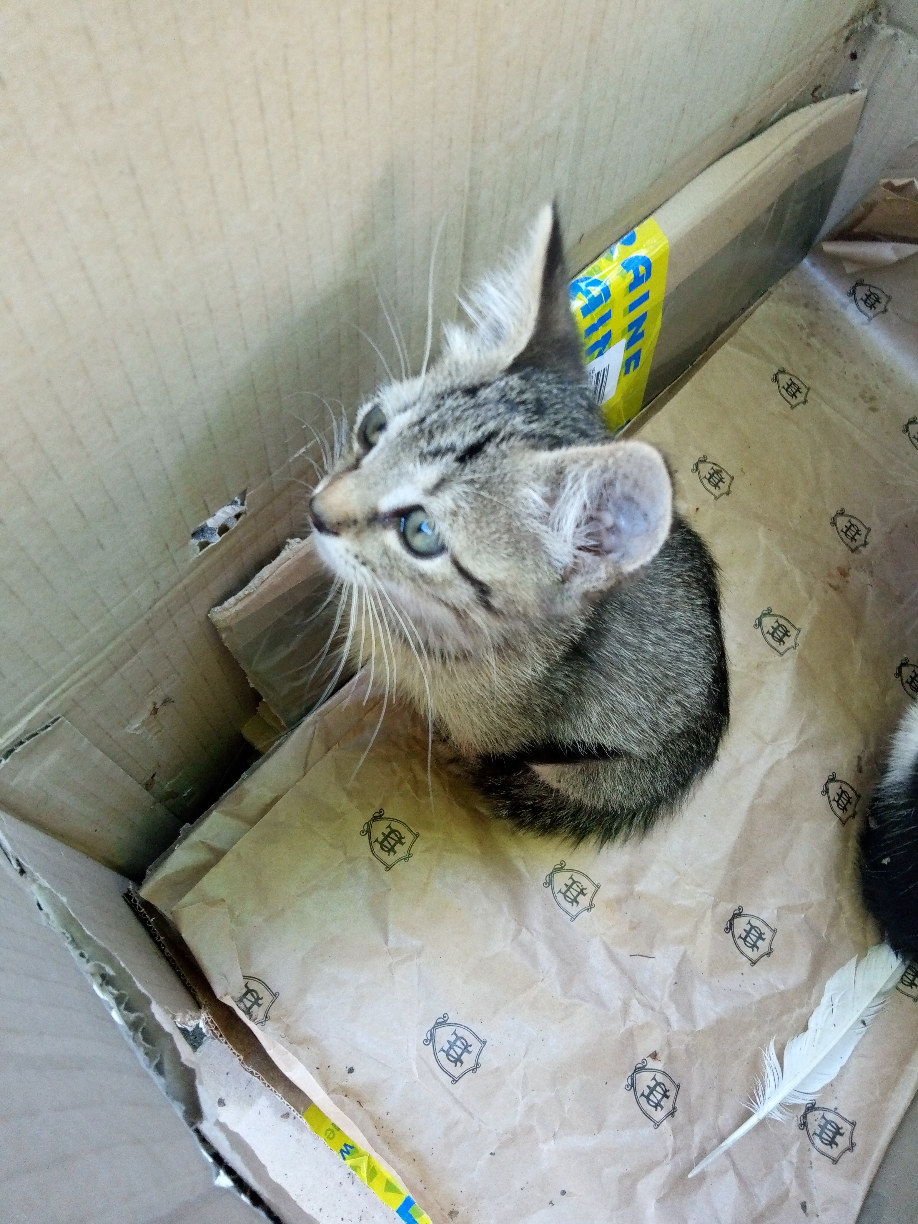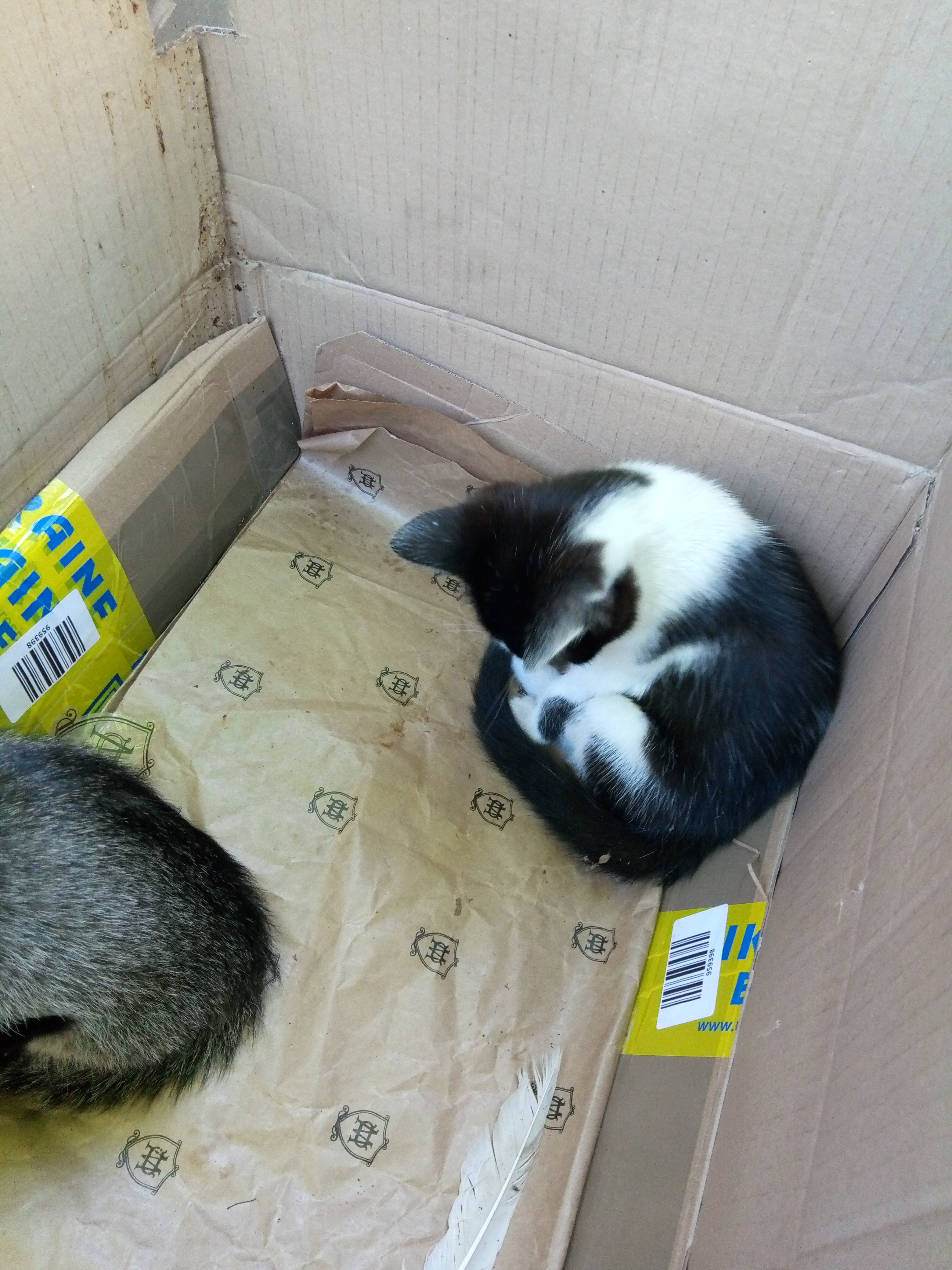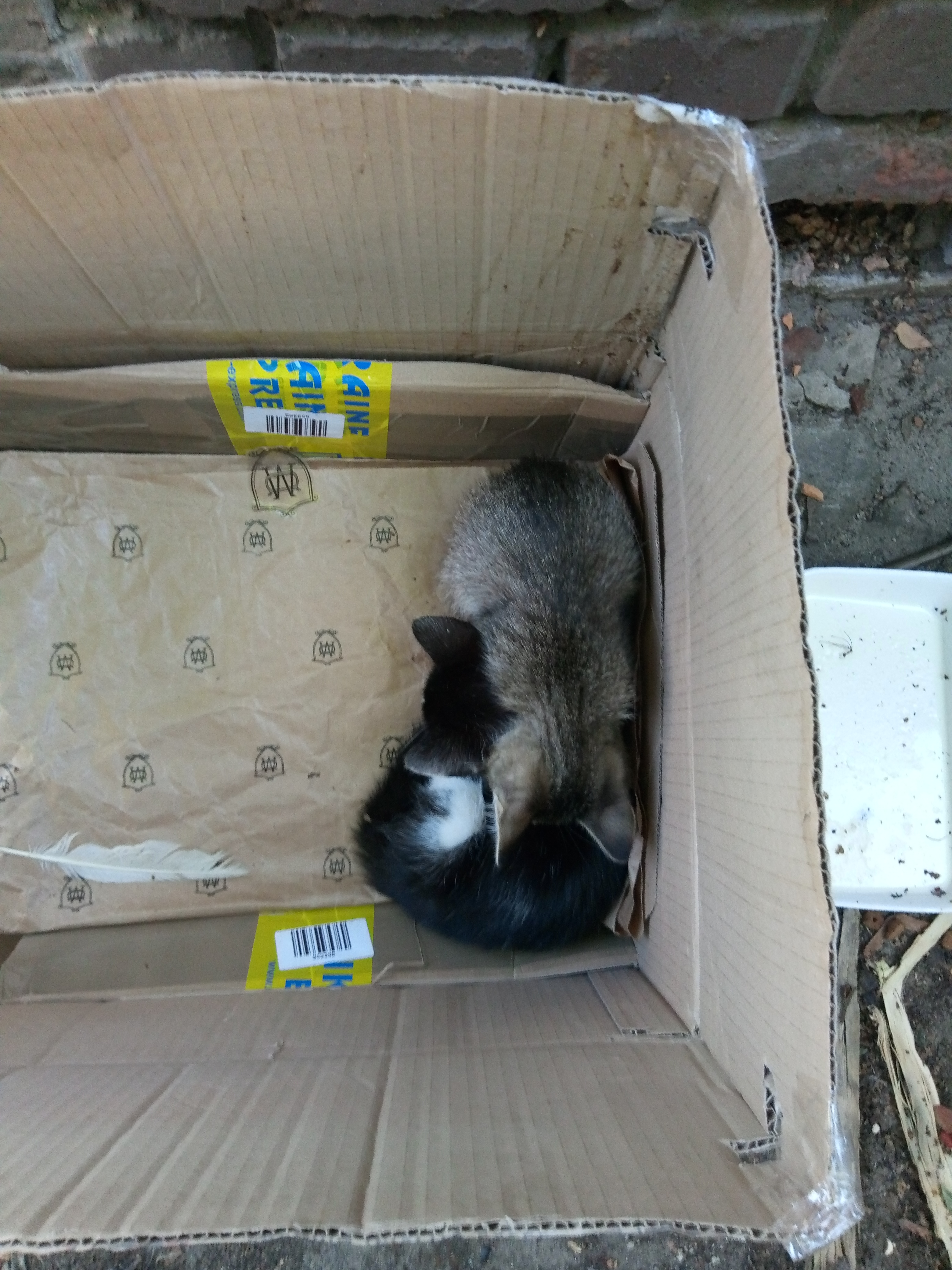 Одним летним понедельником наткнулись на сооруженный домик из картона для двух котят. Его сделали двое мальчиков с большим сердцем(поставили миски с едой и помогали чем могли в силу своего возраста). Мы хотели покормить котят, но увидев их в близи стало ясно, что просто уйти уже нельзя. Полосатый котенок хрюкал от соплей с закисшими глазами, а черно-белая кроха все время сидела что показалось странным. Но на еду девочка(это оказалась девочка) все же выползла... другим словом этот процесс не назовешь... Одна лапа почти не работает, вторая чуть лучше... Вдобавок у девочки ушной клещ ну и у полосатика он тоже, так как ребята очень дружны.