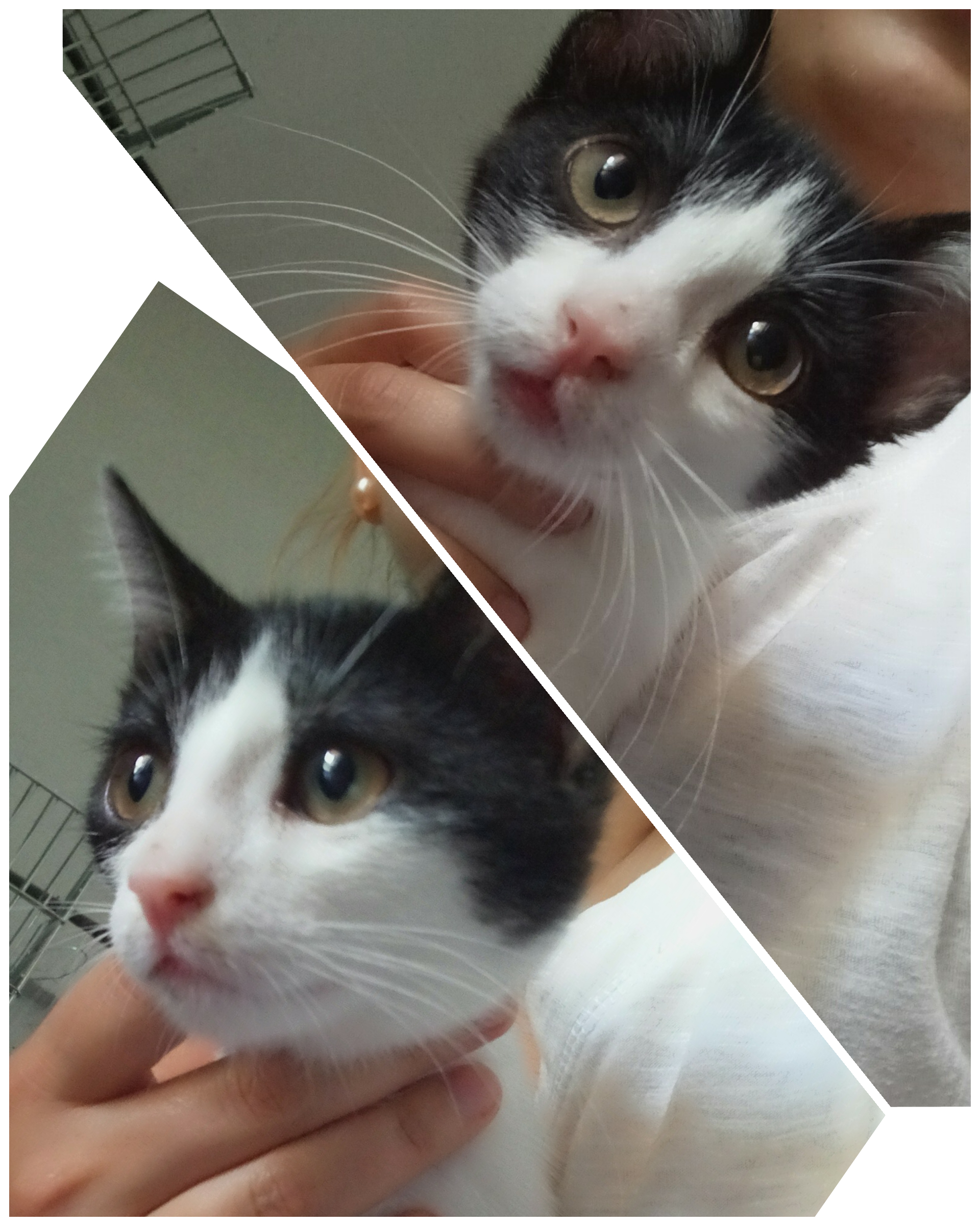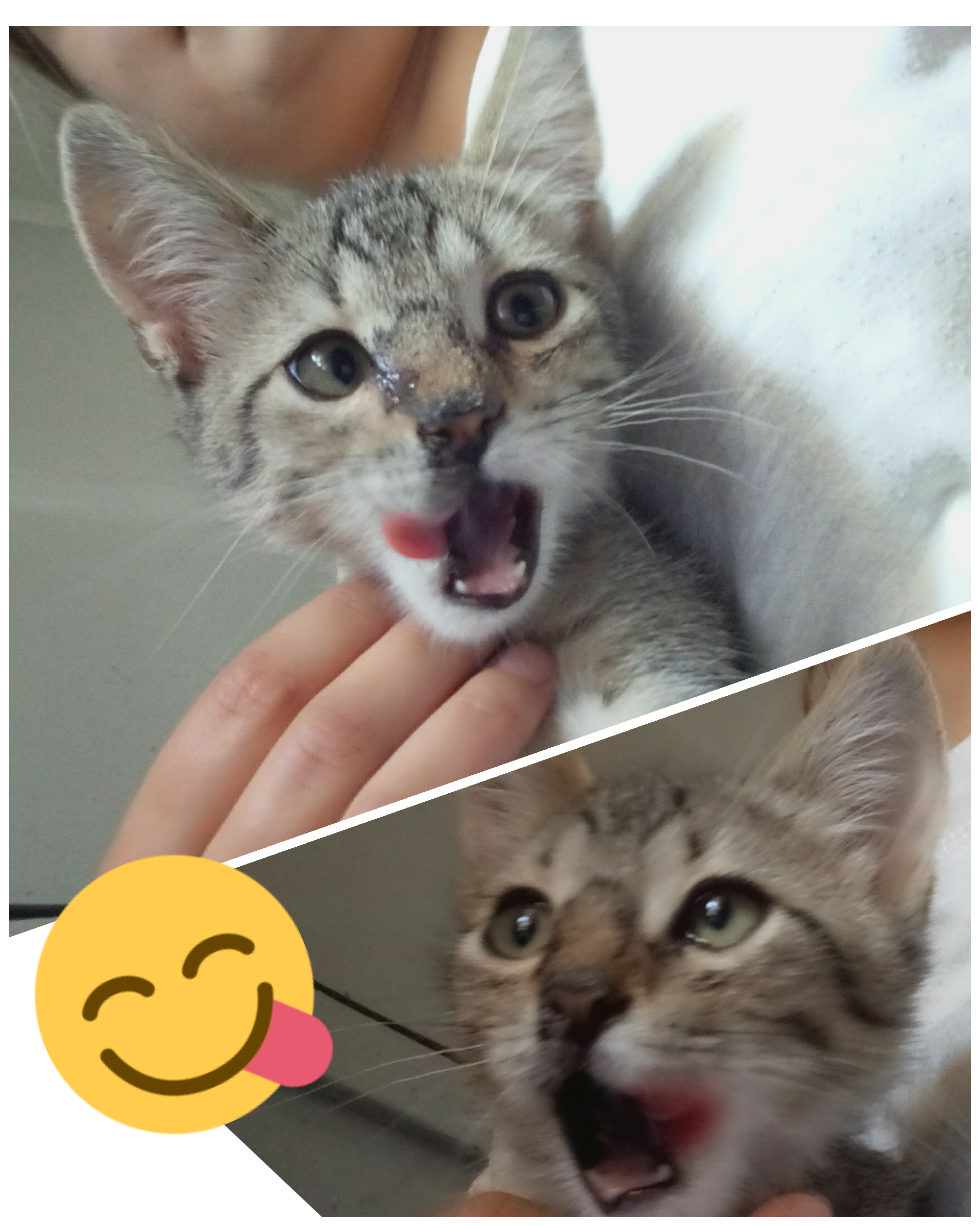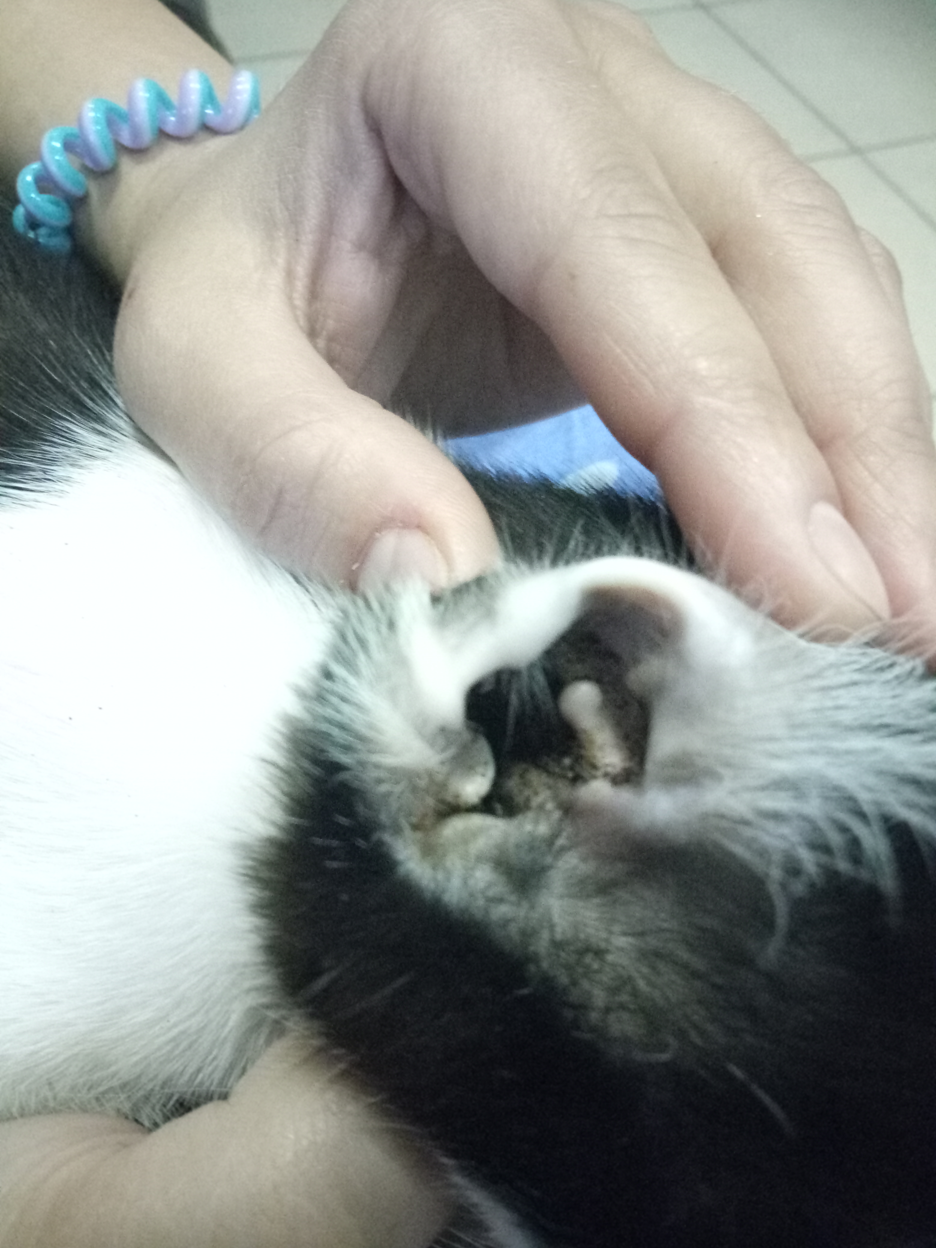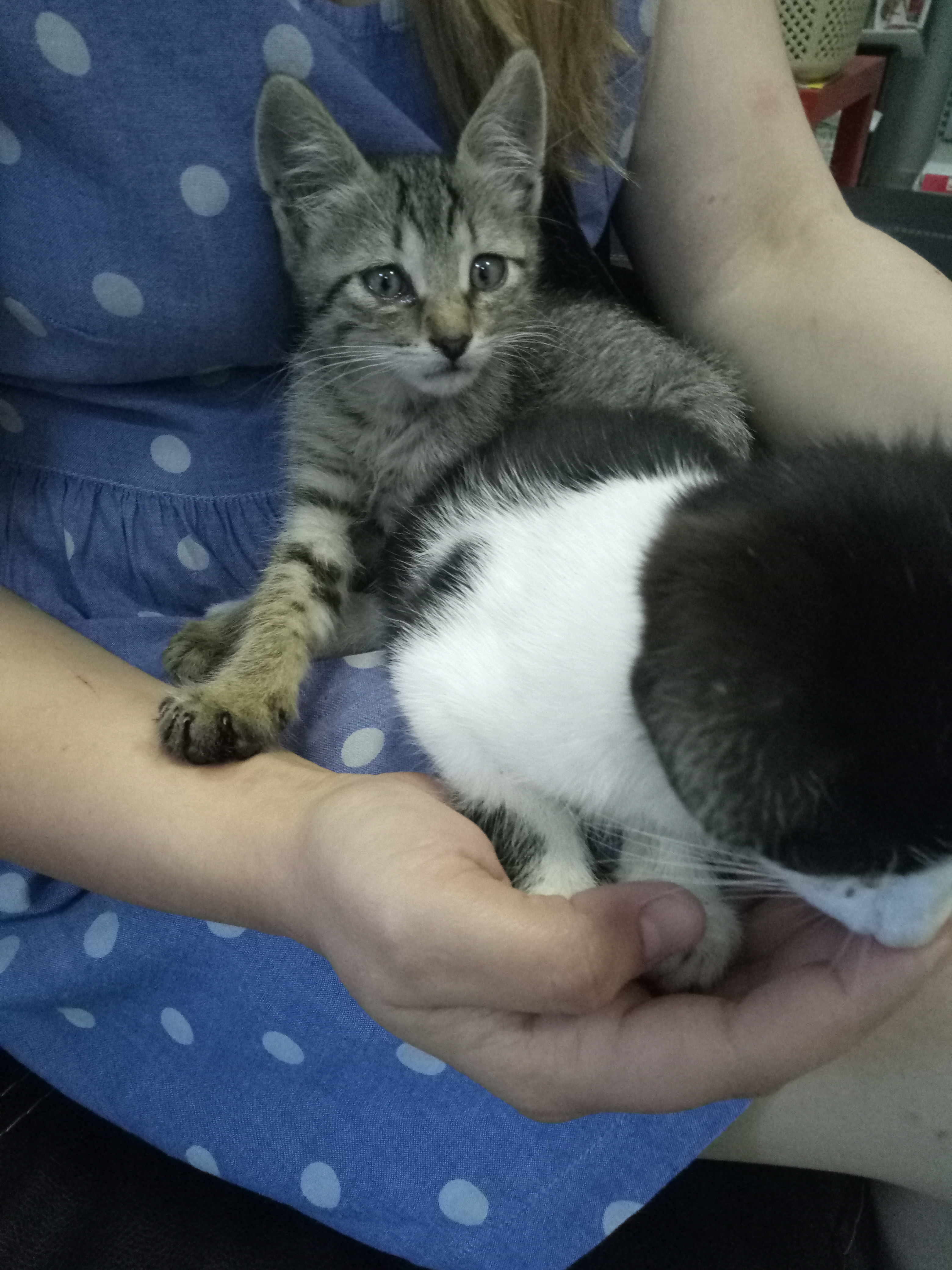 Одним летним понедельником наткнулись на сооруженный домик из картона для двух котят. Его сделали двое мальчиков с большим сердцем(поставили миски с едой и помогали чем могли в силу своего возраста). Мы хотели покормить котят, но увидев их в близи стало ясно, что просто уйти уже нельзя. Полосатый котенок хрюкал от соплей с закисшими глазами, а черно-белая кроха все время сидела что показалось странным. Но на еду девочка(это оказалась девочка) все же выползла... другим словом этот процесс не назовешь... Одна лапа почти не работает, вторая чуть лучше... Вдобавок у девочки ушной клещ ну и у полосатика он тоже, так как ребята очень дружны.