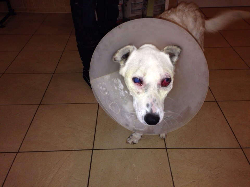 Страшно даже представить, что ей пришлось пережить. Врачи предполагают, что ее травмы глаз - это все-таки дело рук человека. Но все равно она полностью доверяет человеку. На улице идет на голос на дрожащих лапках и пытается уткнуться носиком в колени (но упирается воротник), и так трогательно прижимается к ноге, как будто просит защиты.