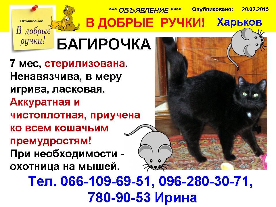 Изумительная по красоте и характеру кошечка-подросток Багирка, 7 мес, стерилизована. Ненавязчива, в меру игрива, ласковая. Станет лучшим другом для людей с непотребительским отношением к животным... Мечтает о любви и понимании... Аккуратная и чистоплотная, приучена ко всем кошшачьим премудростям! При необходимости - охотница на мышей! (см. фото)