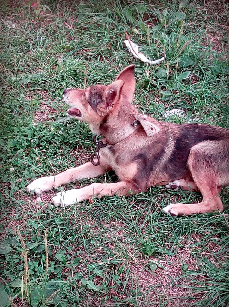 Шея туго стянуто чем-то наподобие строительной ленты и закрыто болтом. Снять пока не удалось, он очень напуган.