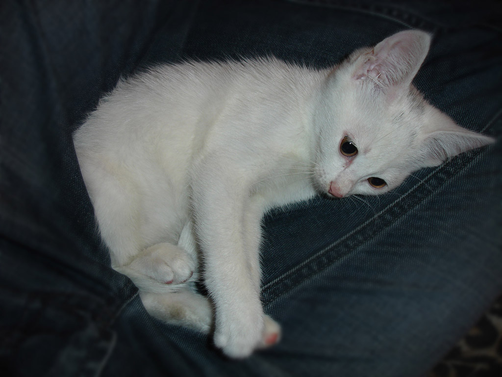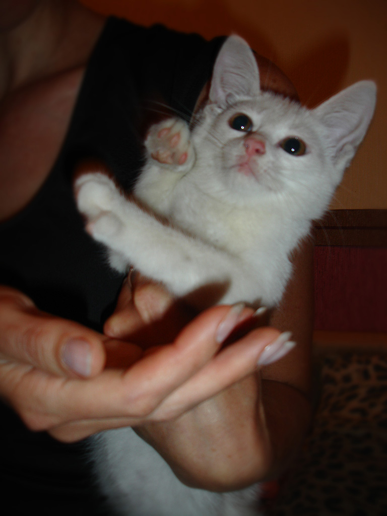 Милейшее создание белого цвета с розовым носом, очень ласковая, ходит в лоток.