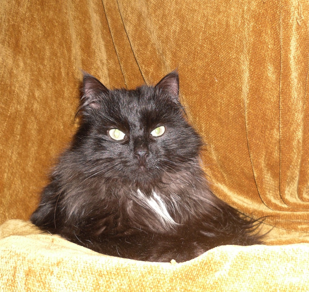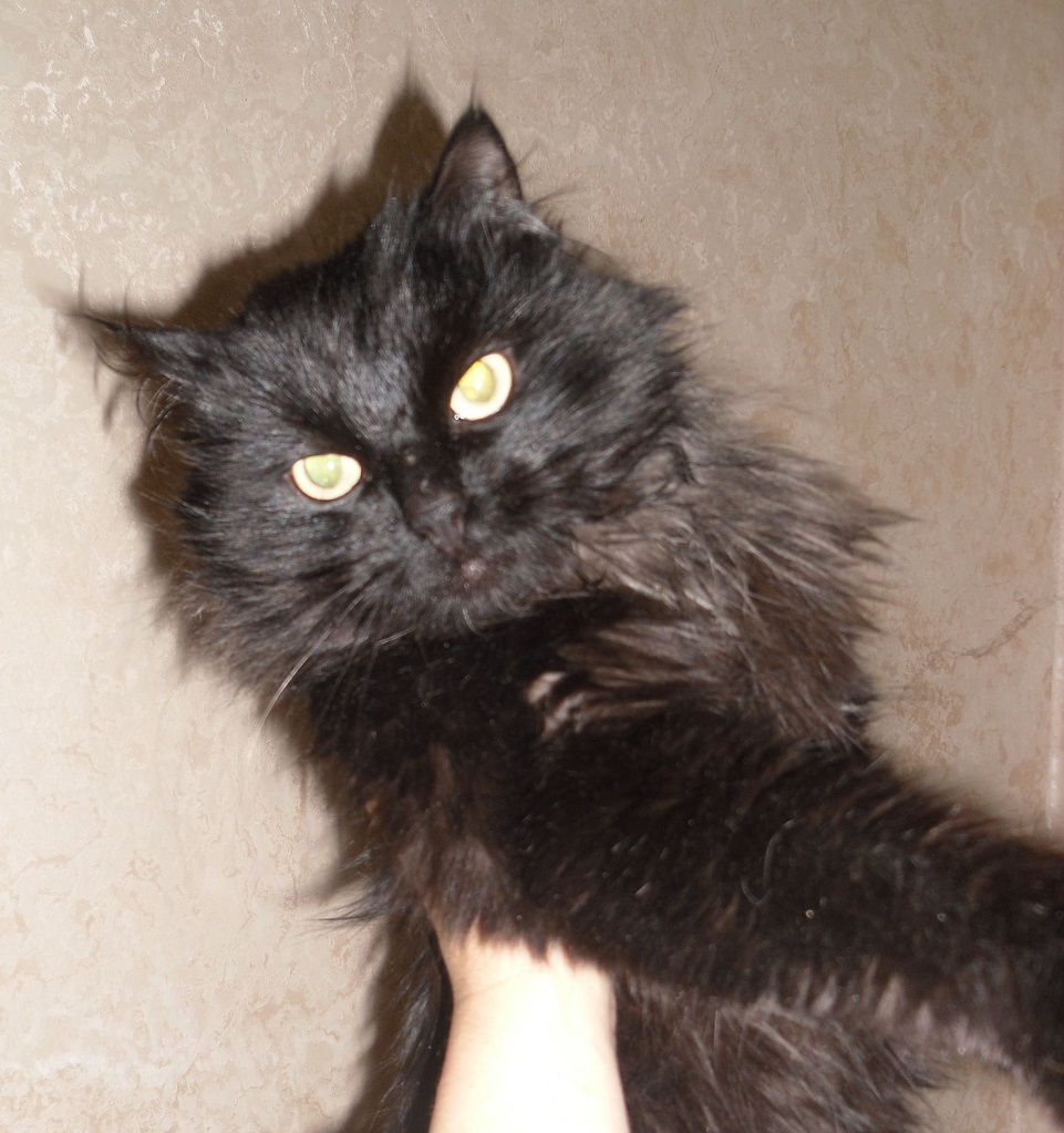 Я решила его забрать, обработать и попытаться найти ему дом, потому что котик перспективный. У него длинная , шелковистая и густая шерсть - на мордочке, спинке и боках смоляно-черная, а животик и воротник дымчатый с белыми волосками. Явно видны признаки персидской породы.