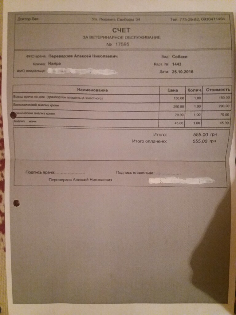 Вкладываю чек из вет. Клиники Дружочек от 03.10.16